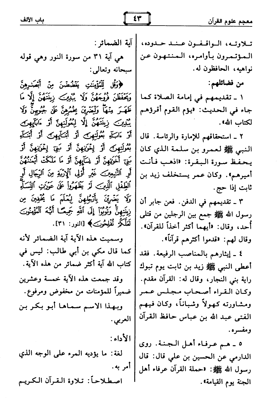 2 - استحقاقهم للإمارة والرئاسة. قال النبي صلّى الله عليه وسلّم لعمرو بن سلمة الذي كان يحفظ سورة البقرة: اذهب فأنت أميرهم. وكان عمر يستخلف زيد بن ثابت إذا حج.