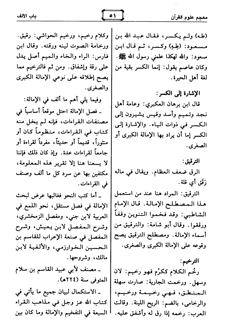 الترقيق: المراد هنا عند من استعمل هذا المصطلح الإمالة. قال الإمام الشاطبي: وقد فخموا التنوين وقفا ورققوا. وقال أبو شامة: والترقيق من أسماء الإمالة. ومصطلح الترقيق يصح وقوعه على الإمالة الكبرى والصغرى.
