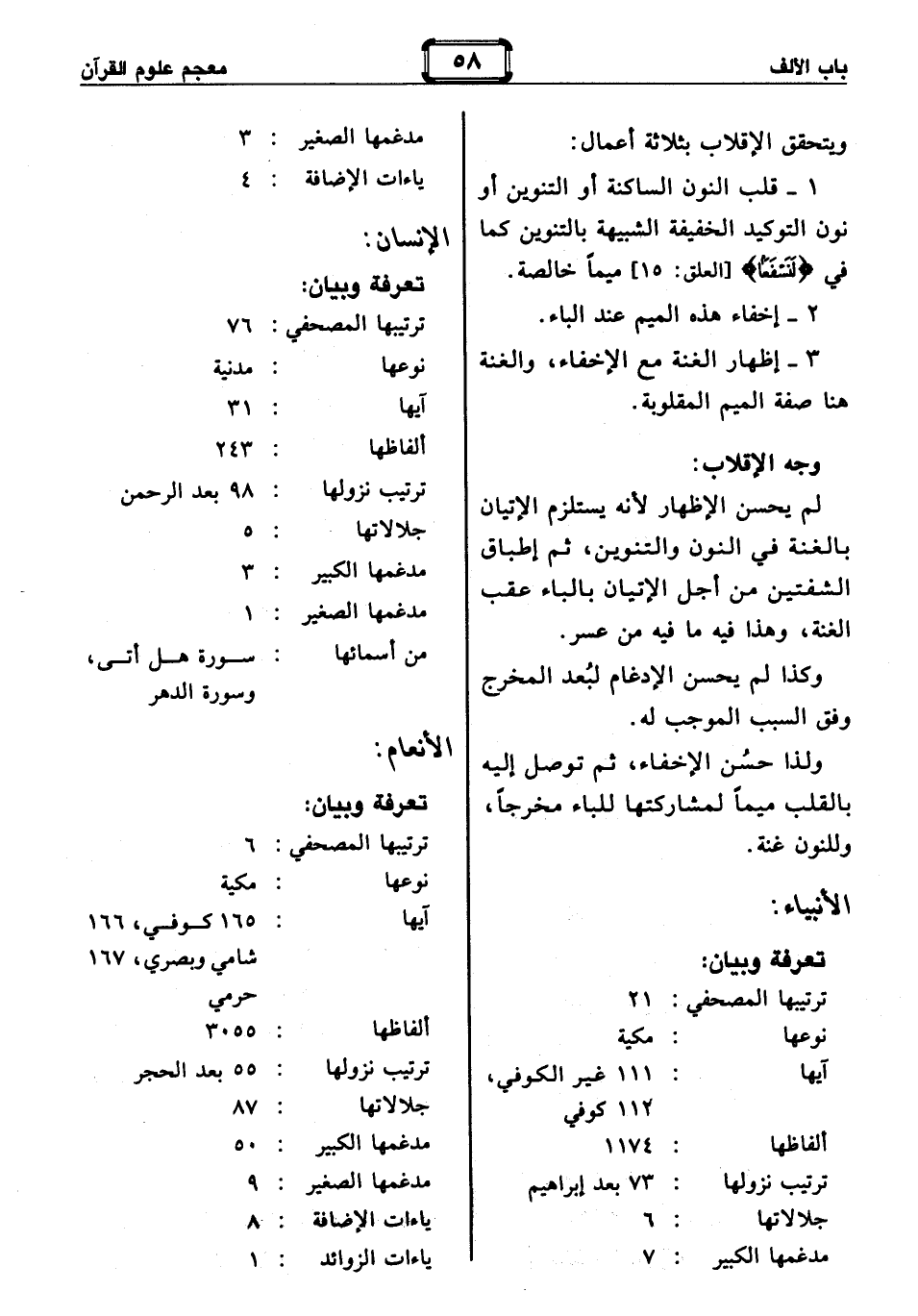 : ترتيبها المصحفي: 76 نوعها: مدنية آيها: 31 ألفاظها: 243 ترتيب نزولها: 98 بعد الرحمن جلالاتها: 5 مدغمها الكبير: 3 مدغمها الصغير: 1 من أسمائها: سورة هل أتى،