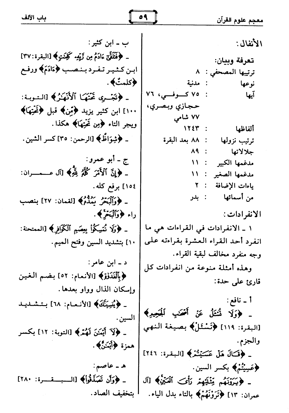: ترتيبها المصحفي: 8 نوعها: مدنية آيها: 75 كوفي، 76 حجازي وبصري، 77 شامي ألفاظها: 1243 ترتيب نزولها: 88 بعد البقرة جلالاتها: 89 مدغمها الكبير: 11 مدغمها الصغير: 11 ياءات الإضافة: 2 من أسمائها: بدر