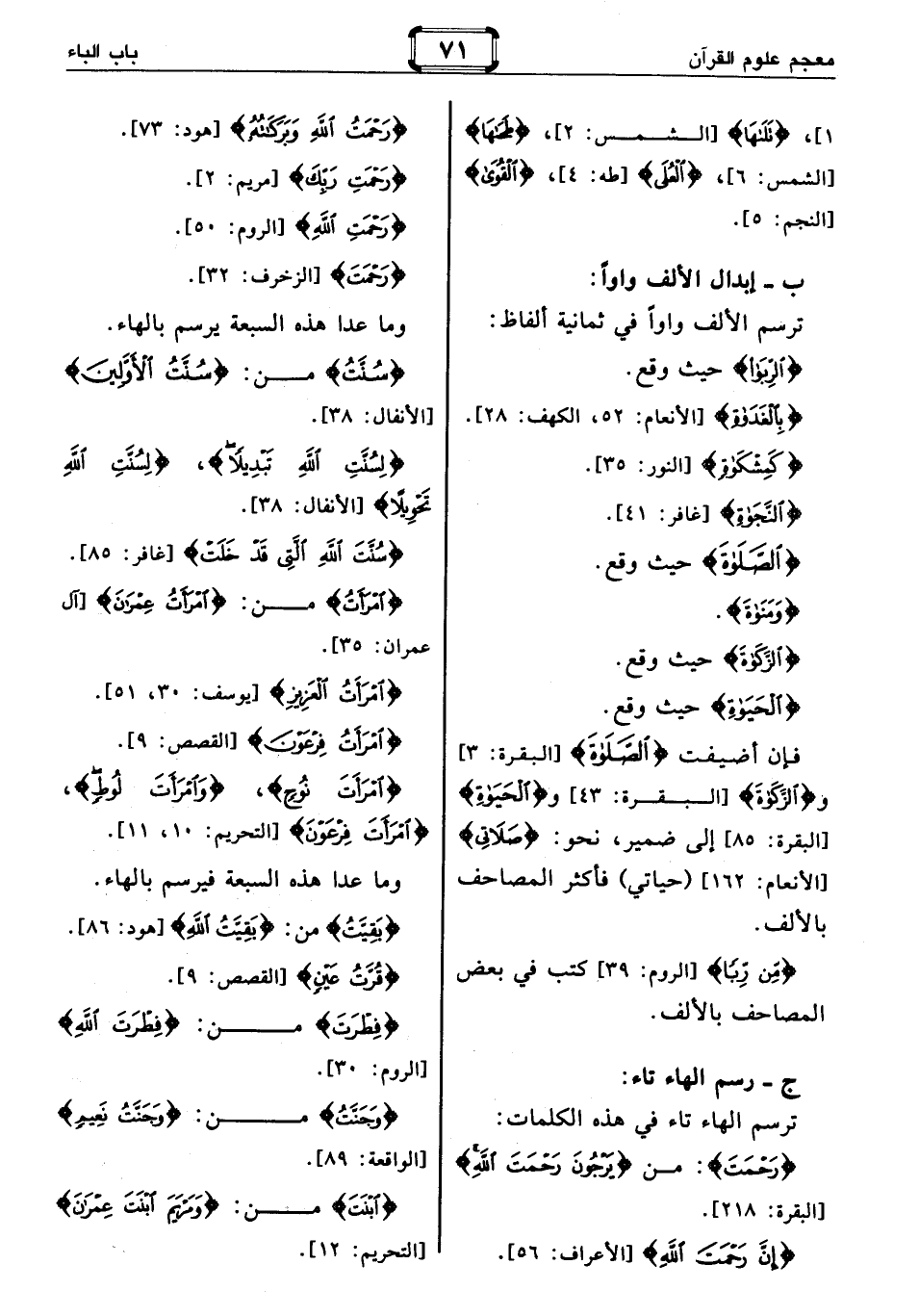 فإن أضيفت الصلاة* [البقرة: 3] والزكوة* [البقرة: 43] والحيوة* [البقرة: 85] إلى ضمير، نحو: صَلاتِي [الأنعام: 162] (حياتي) فأكثر المصاحف بالألف.