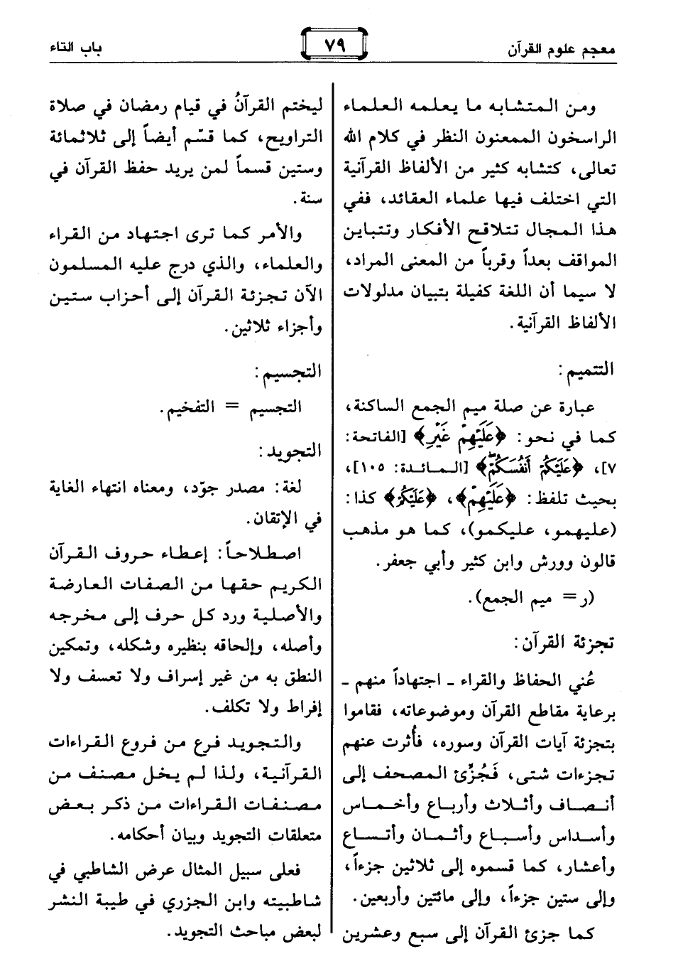 اصطلاحا: إعطاء حروف القرآن الكريم حقها من الصفات العارضة والأصلية ورد كل حرف إلى مخرجه وأصله، وإلحاقه بنظيره وشكله، وتمكين النطق به من غير