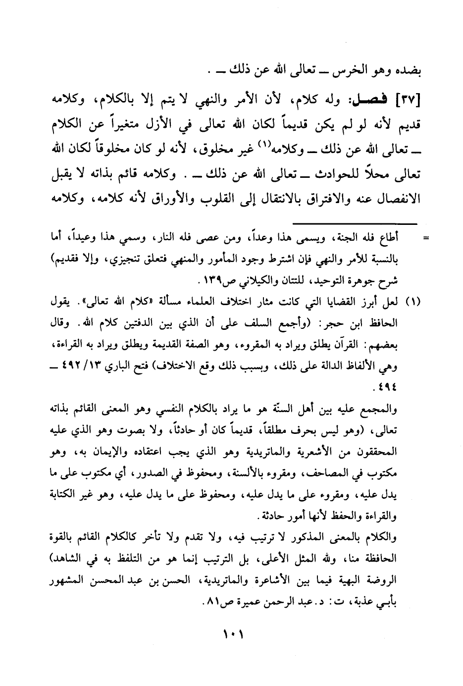وَله كَلَام لِأَن الْأَمر وَالنَّهْي لَا يتم إِلَّا بالْكلَام وَكَلَامه قديم لِأَنَّهُ لَو لم يكن قَدِيما لَكَانَ الله تَعَالَى فِي الْأَزَل متغيرا عَن الْكَلَام تَعَالَى الله عَن ذَلِك وَكَلَامه غير مَخْلُوق لِأَنَّهُ لَو كَانَ مخلوقا لَكَانَ الله تَعَالَى الله عَن ذَلِك وَكَلَامه غير مَخْلُوق لِأَنَّهُ لَو كَانَ مخلوقا لَكَانَ الله تَعَالَى محلا للحوادث تَعَالَى الله عَن ذَلِك وَكَلَامه قَائِم بِذَاتِهِ لَا يقبل الِانْفِصَال عَنهُ والافتراق بالانتقال الى الْقُلُوب والأوراق لِأَنَّهُ كَلَامه وَكَلَامه