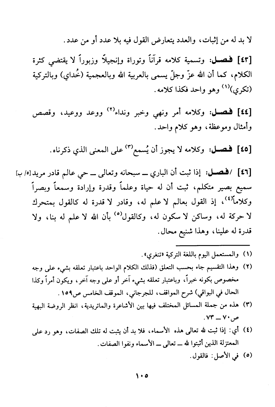 إِذا ثَبت أَن الْبَارِي سُبْحَانَهُ وَتَعَالَى حَيّ عَالم قَادر مُرِيد سميع بصر مُتَكَلم ثَبت أَن لَهُ حَيَاة وعلما وقدرة وَإِرَادَة وسمعا وبصيرا وكلاما إِذْ القَوْل بعالم لَا علم لَهُ وقادر لَا قدرَة لَهُ كالقول بمتحرك لَا حَرَكَة لَهُ وَسَاكن لَا سُكُون لَهُ وكالقول بِأَن الله لَا علم لَهُ بِنَا وَلَا قدرَة لَهُ علينا وَهَذَا شنيع محَال