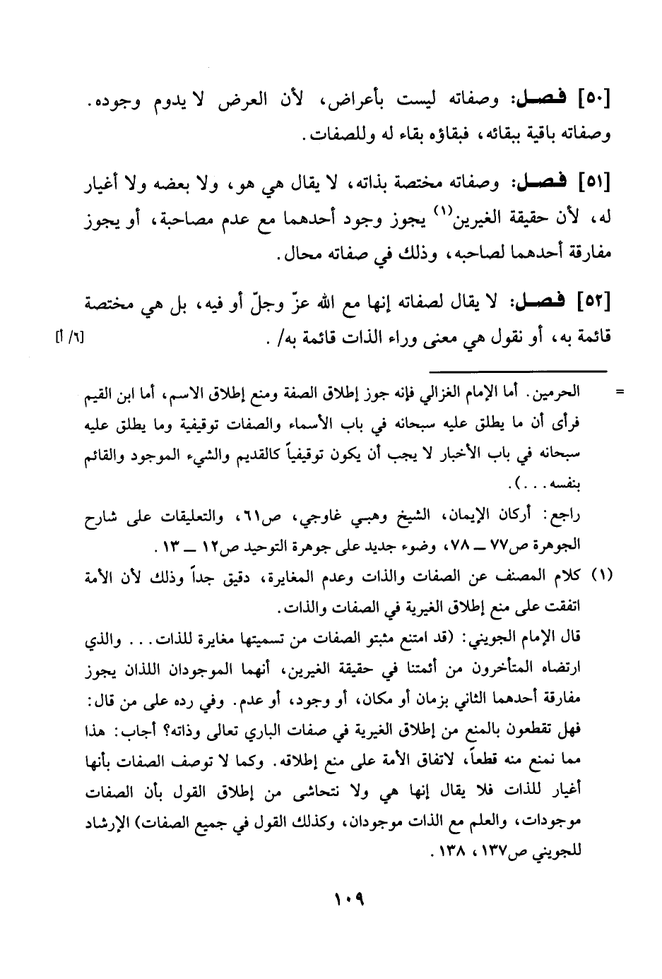 وَصِفَاته مُخْتَصَّة بِذَاتِهِ لَا يُقَال هِيَ هُوَ وَلَا بعضه لَا أغيار لَهُ لِأَن حَقِيقَة الغيرين يجوز وجود أَحدهمَا مَعَ عدم مصاحبة أَو يجوز مُفَارقَة أَحدهمَا لصَاحبه وَذَلِكَ فِي صِفَاته محَال