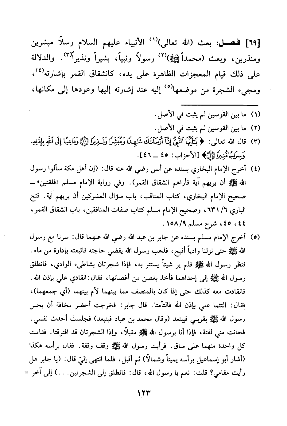 بعث الله تَعَالَى الْأَنْبِيَاء عَلَيْهِم السَّلَام رسلًا مبشرين ومنذرين وَبعث مُحَمَّدًا صلى الله عَلَيْهِ وَسلم رَسُولا وَنَبِيًّا بشيرا وَنَذِيرا وَالدّلَالَة على ذَلِك قيام المعجزات الظَّاهِرَة على يَده كانشقاق الْقَمَر بإشارته ومجيء الشَّجَرَة من موضعهَا إِلَيْهِ عِنْد إِشَارَته إِلَيْهَا وعودها إِلَى مَكَانهَا