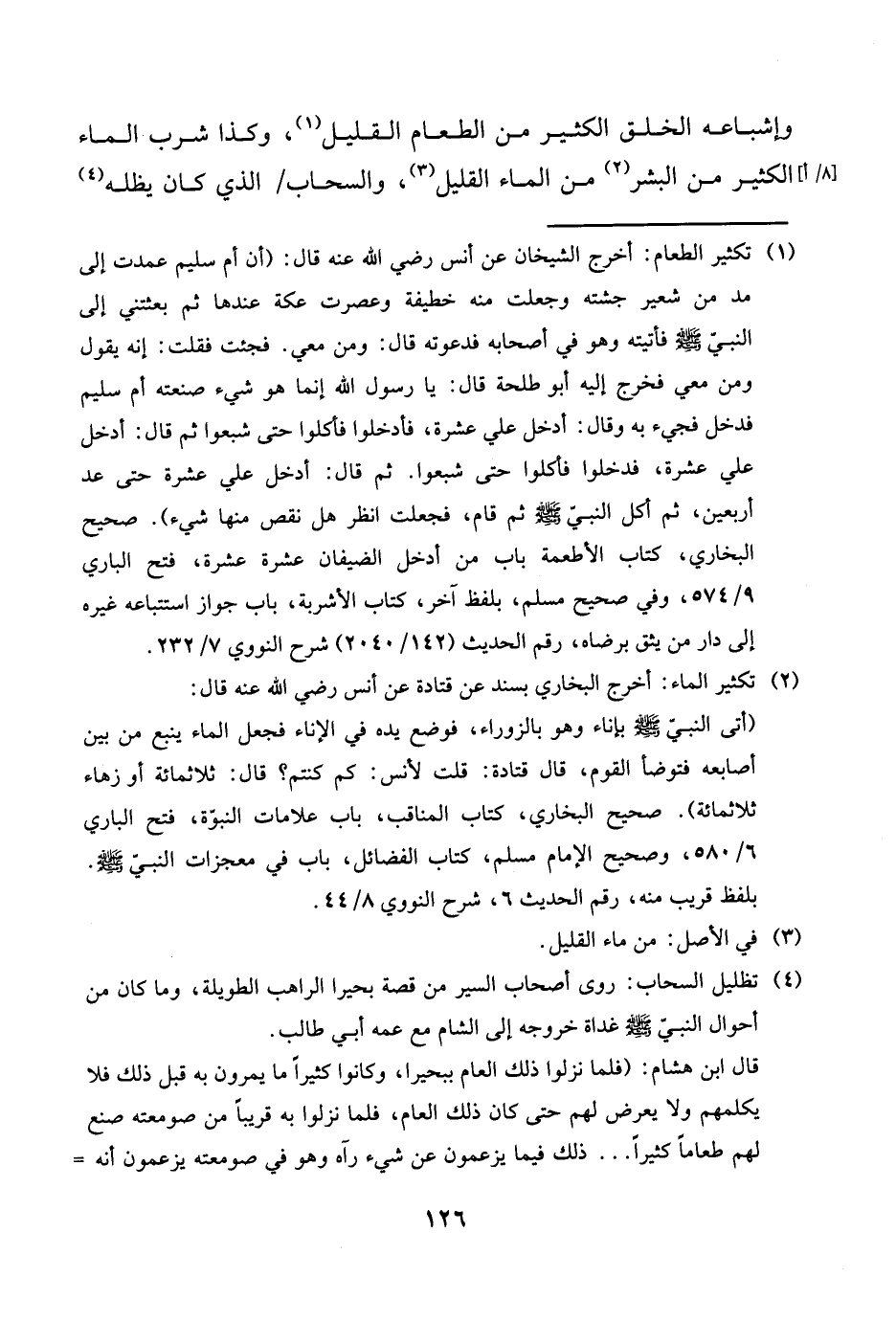 وإشباعه الْخلق الْكثير من الطَّعَام الْقَلِيل وَكَذَا شرب المَاء الْكثير من الْبشر من المَاء الْقَلِيل والسحاب الَّذِي كَانَ يظله