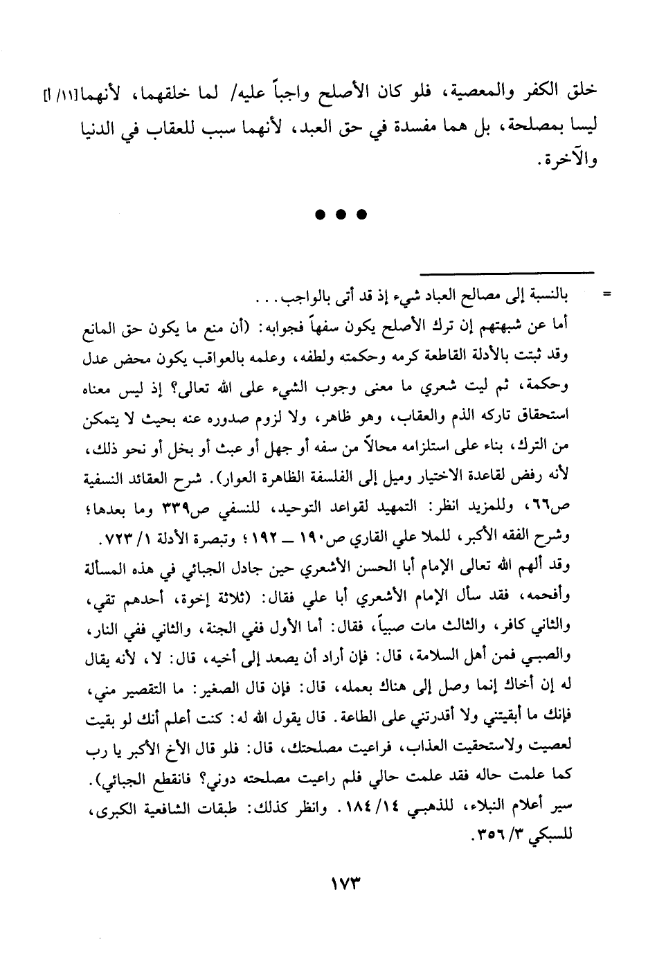 خلق الْكفْر وَالْمَعْصِيَة فَلَو كَانَ الْأَصْلَح وَاجِبا عَلَيْهِ لما خلقهما لِأَنَّهُمَا ليسَا بمصلحة بل هما مفْسدَة فِي حق العَبْد لِأَنَّهُمَا سَبَب للعقاب فِي الدُّنْيَا وَالْآخِرَة