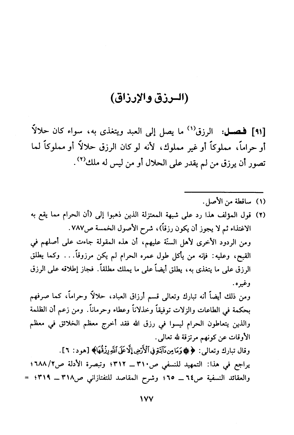 الرزق مَا يصل إِلَى العَبْد ويتغذى بِهِ سَوَاء كَانَ حَلَالا أَو حَرَامًا مَمْلُوكا أَو غير مَمْلُوك لِأَنَّهُ لَو كَانَ الرزق حَلَالا أَو مَمْلُوكا لما تصور أَن يرْزق من لم يقدر على الْحَلَال أَو من لَيْسَ لَهُ ملك