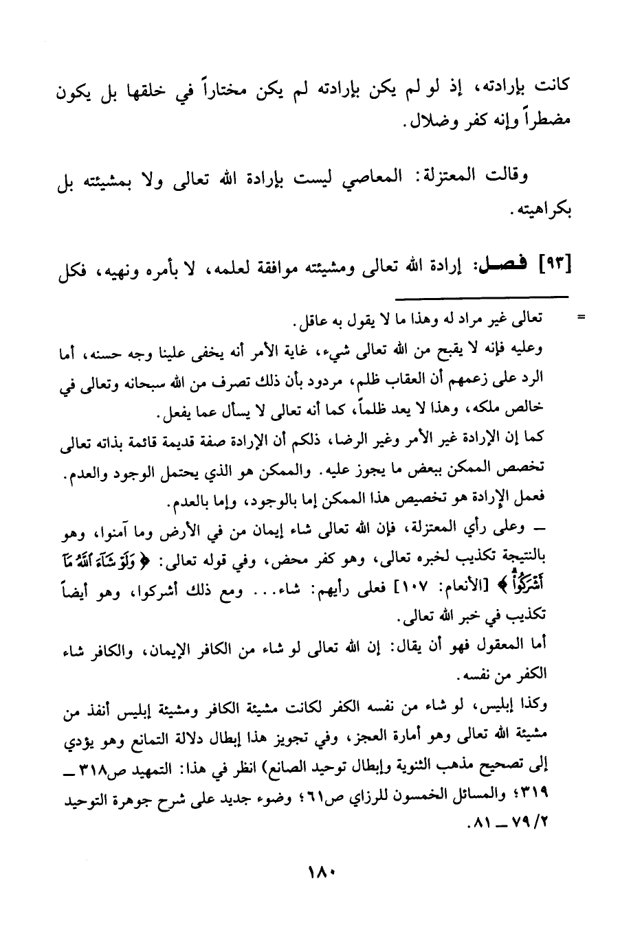 وَقَالَت الْمُعْتَزلَة الْمعاصِي لَيست بِإِرَادَة الله تَعَالَى وَلَا بمشيئته بل بكراهيته