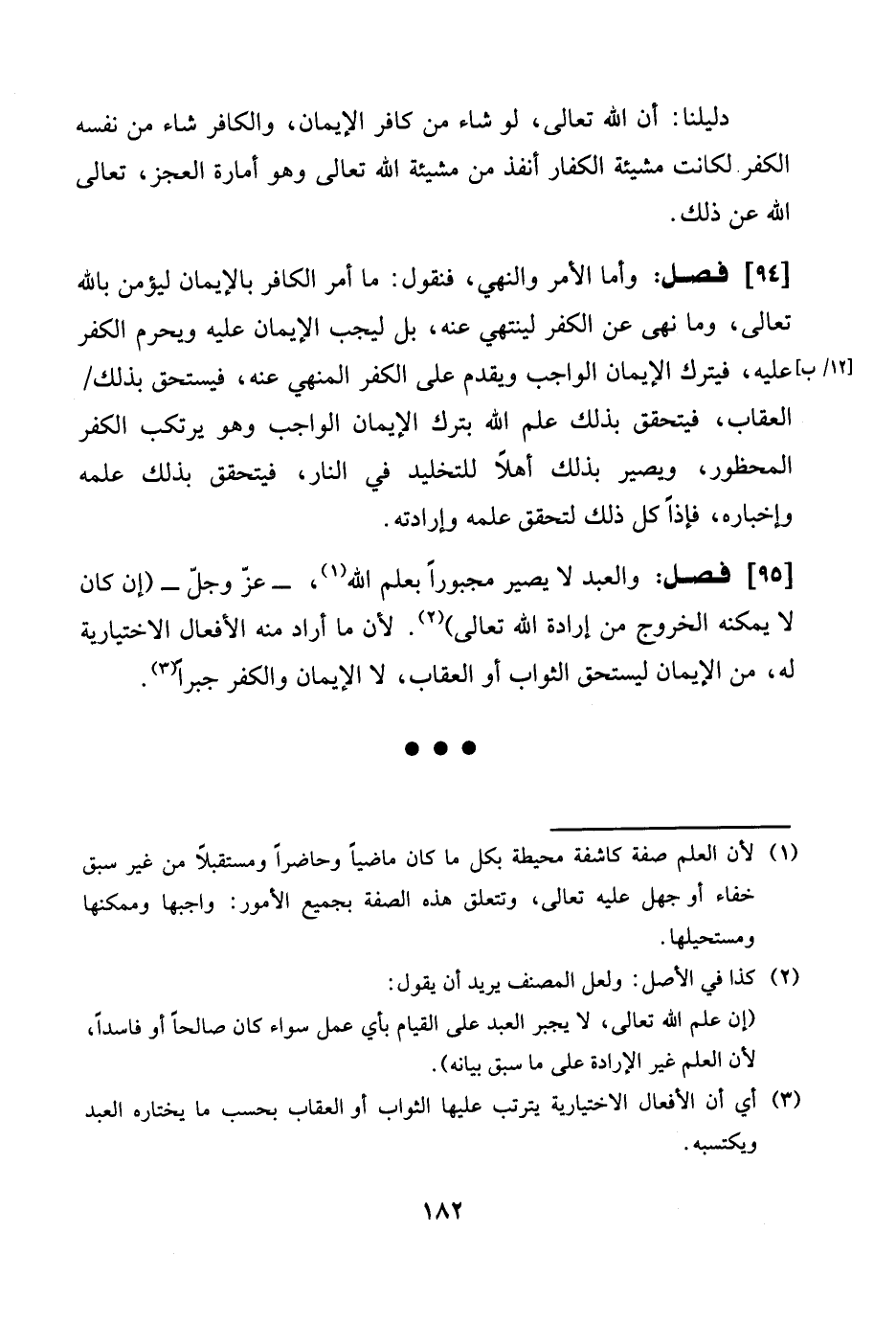 وَالْعَبْد لَا يصير مجبورا بِعلم الله عز وَجل إِن كَانَ لَا يُمكنهُ الْخُرُوج من إِرَادَة الله تَعَالَى لِأَن مَا أَرَادَ مِنْهُ الْأَفْعَال الاختيارية لَهُ من الْإِيمَان ليستحق الثَّوَاب أَو الْعقَاب لَا الْإِيمَان وَالْكفْر جبرا