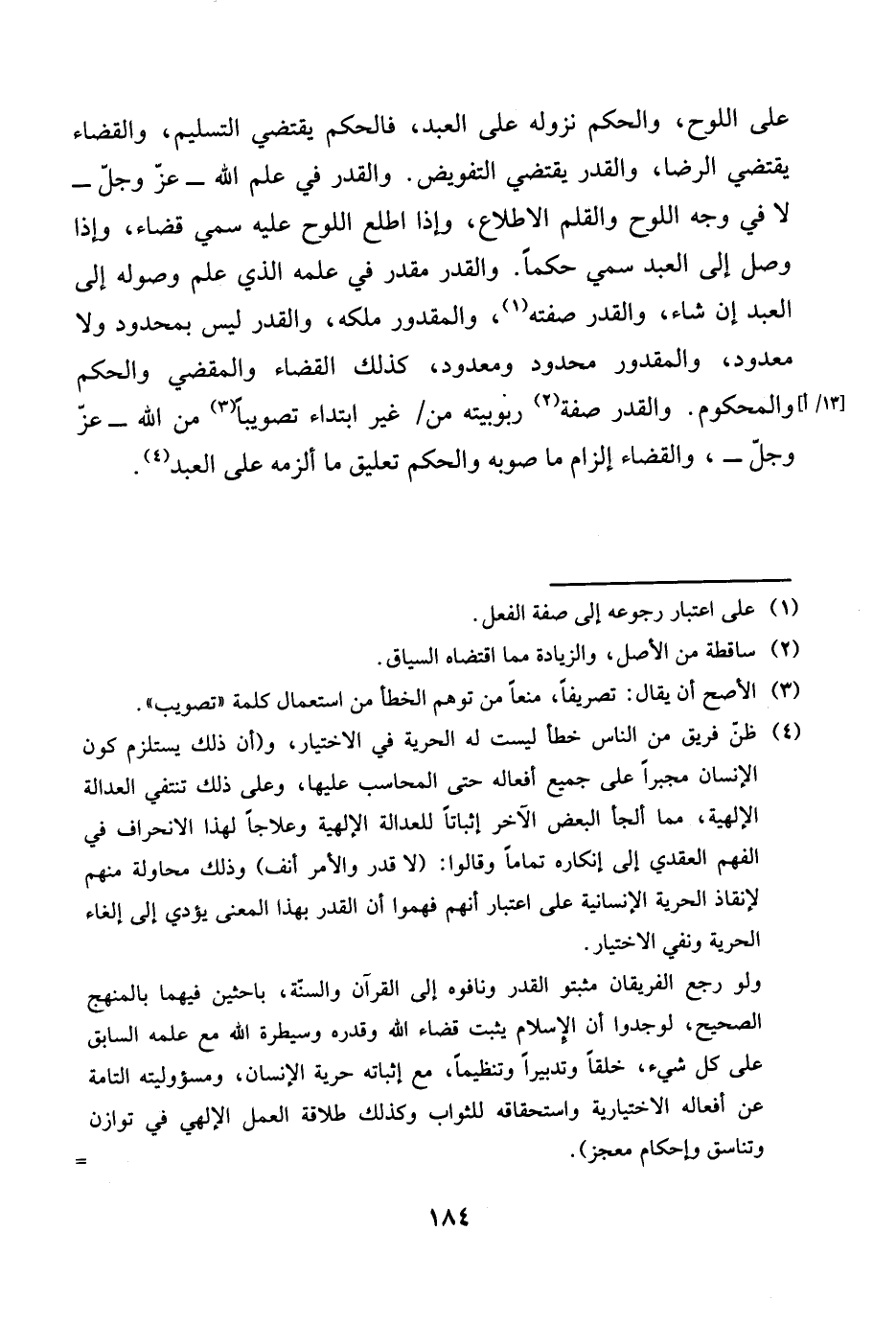 على اللَّوْح وَالْحكم نُزُوله على العَبْد فَالْحكم يَقْتَضِي التَّسْلِيم وَالْقَضَاء يَقْتَضِي الرِّضَا وَالْقدر يَقْتَضِي التَّفْوِيض وَالْقدر فِي علم الله عز وَجل لَا فِي وَجه اللَّوْح والقلم الِاطِّلَاع وَإِذا اطلع اللَّوْح عَلَيْهِ سمي قَضَاء وَإِذا وصل إِلَى العَبْد سمي حكما وَالْقدر مُقَدّر فِي علمه الَّذِي علم وُصُوله إِلَى العَبْد ان شَاءَ وَالْقدر صفته والمقدور ملكه وَالْقدر لَيْسَ بمحدود وَلَا مَعْدُود والمقدور مَحْدُود ومعدود كَذَلِك الْقَضَاء والمقضي وَالْحكم والمحكوم وَالْقدر صفة ربوبيته من غير ابْتِدَاء تصويبا من الله عز وَجل وَالْقَضَاء إِلْزَام مَا صَوبه وَالْحكم تَعْلِيق مَا الزمه على العَبْد