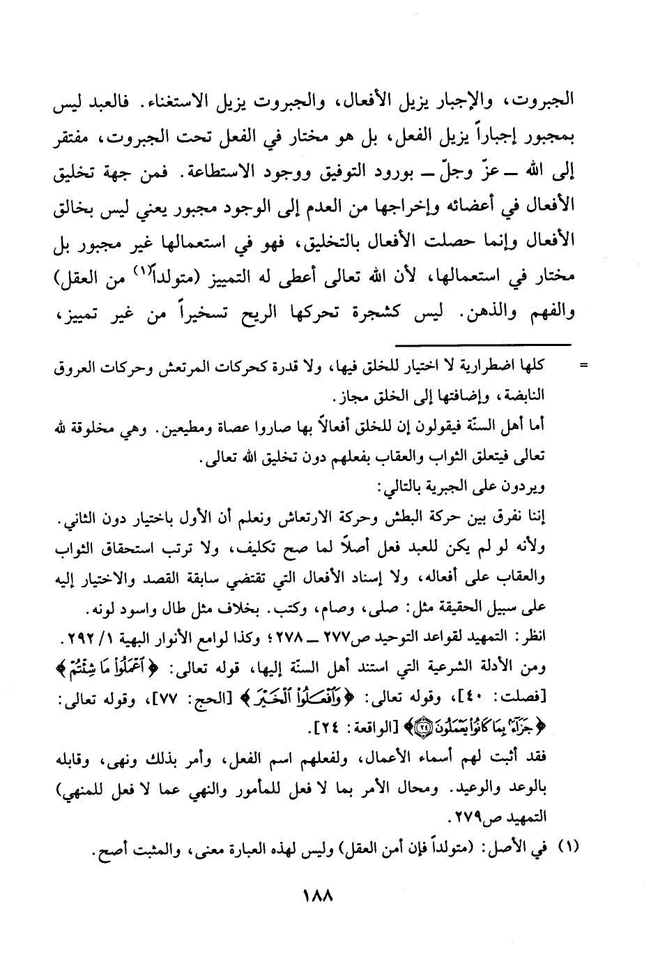 الجبروت والإجبار يزِيل الْأَفْعَال والجبروت يزِيل الِاسْتِغْنَاء فَالْعَبْد لَيْسَ بمجبور إجبارا يزِيل الْفِعْل بل هُوَ مُخْتَار فِي الْفِعْل تَحت الجبروت مفتقر إِلَى الله عز وَجل بورود التَّوْفِيق وَوُجُود الِاسْتِطَاعَة فَمن جِهَة تخليق الْأَفْعَال فِي أَعْضَائِهِ وإخراجها من الْعَدَم إِلَى الْوُجُود مجبور يَعْنِي لَيْسَ بخالق الْأَفْعَال وَإِنَّمَا حصلت الْأَفْعَال بالتخليق فَهُوَ فِي اسْتِعْمَالهَا غير مجبور بل مُخْتَار فِي اسْتِعْمَالهَا لِأَن الله تَعَالَى أعْطى لَهُ التَّمْيِيز متولدا من الْعقل والفهم والذهن لَيْسَ كشجرة تحركها الرّيح تسخيرا من غير تَمْيِيز