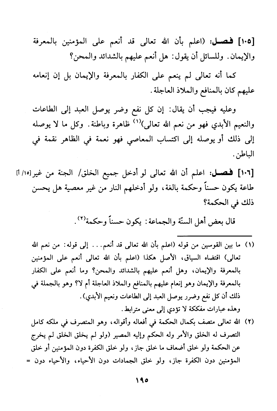 اعْلَم أَن الله تَعَالَى لَو أَدخل جَمِيع الْخلق الْجنَّة من غير طَاعَة يكون حسنا وَحِكْمَة بَالِغَة وَلَو أدخلهم النَّار من غير مَعْصِيّة هَل يحسن ذَلِك فِي الْحِكْمَة