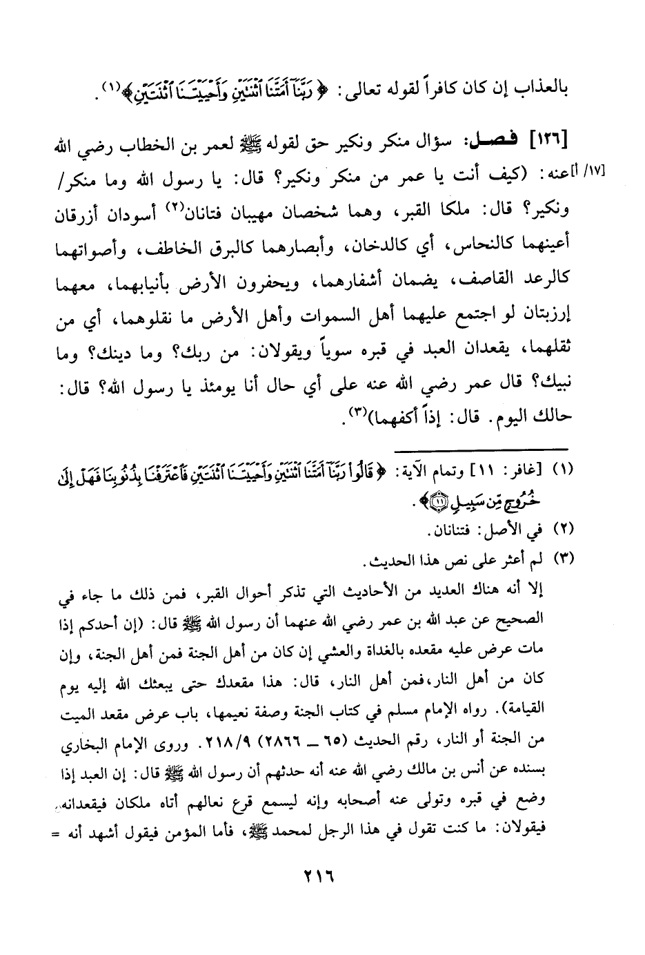 سُؤال مُنكر وَنَكِير حق لقَوْله صلى الله عَلَيْهِ وَسلم لعمر بن الْخطاب رَضِي الله عَنهُ (كَيفَ أَنْت يَا عمر من مُنكر وَنَكِير) قَالَ يَا رَسُول الله وَمَا مُنكر وَنَكِير قَالَ (ملكا الْقَبْر وهما شخصان مهيبان فتانان أسودان أزرقان أعينهما كالنحاس أَي كالدخان وأبصارهما كالبرق الخاطف وأصواتهما كالرعد القاصف يضمان أشفارهما ويحفرون الأَرْض بأنيابهما مَعَهُمَا إرزبتان لَو اجْتمع عَلَيْهِمَا أهل السَّمَوَات وَأهل الأَرْض مَا نقلوهما أَي من ثقلهما يقعدان العَبْد فِي قَبره سويا ويقولان من رَبك وَمَا دينك وَمَا نبيك) قَالَ عمر رَضِي الله عَنهُ على أَي حَال أَنا يَوْمئِذٍ يَا رَسُول الله قَالَ (حالك الْيَوْم) قَالَ إِذا أكفهما