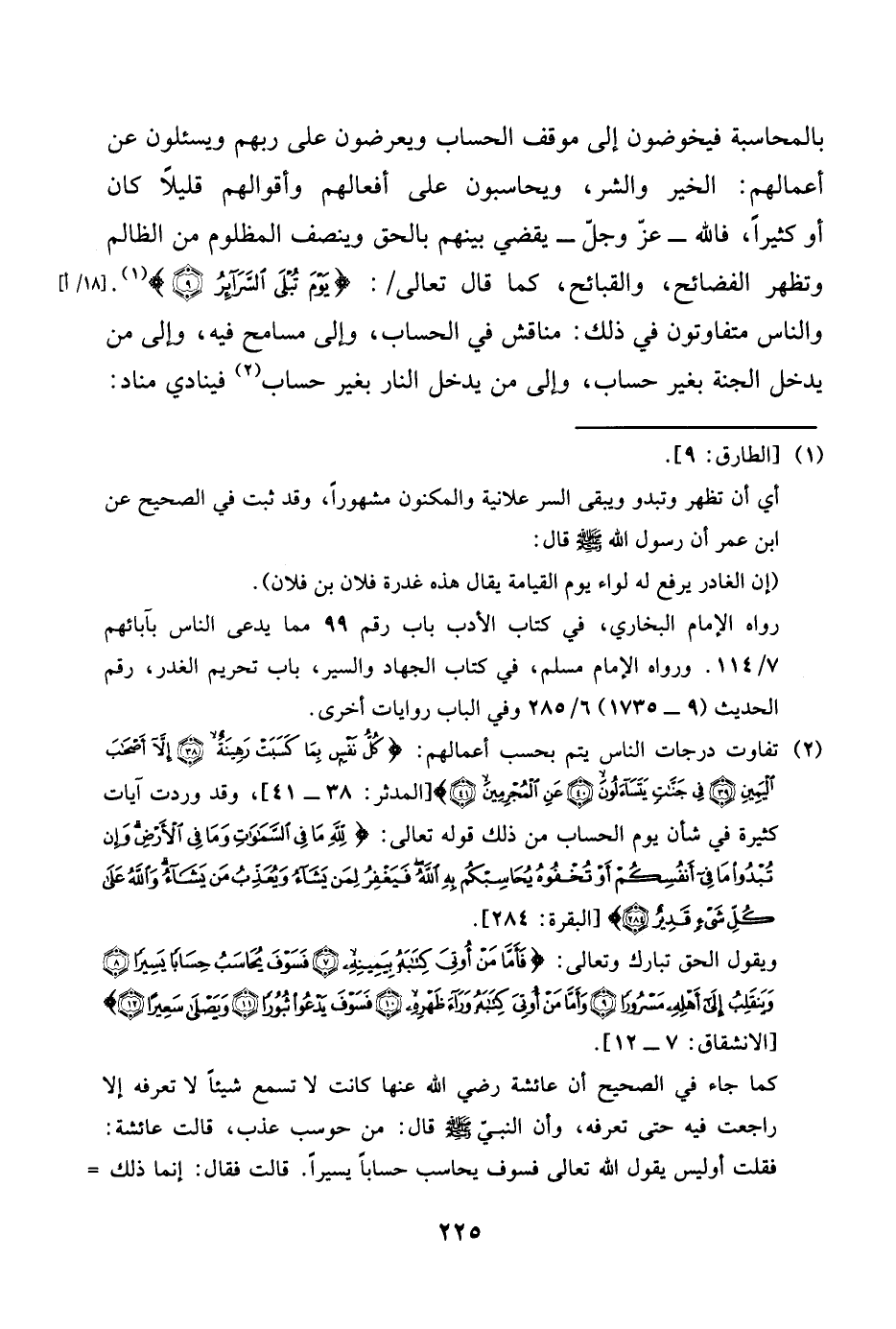 بالمحاسبة فيخوضون إِلَى موقف الْحساب ويعرضون على رَبهم ويسئلون عَن أَعْمَالهم الْخَيْر وَالشَّر ويحاسبون على أفعالهم وأقوالهم قَلِيلا كَانَ أَو كثيرا فَالله عز وَجل يقْضِي بَينهم بِالْحَقِّ وينصف الْمَظْلُوم من الظَّالِم وَتظهر الفضائح والقبائح كَمَا قَالَ تَعَالَى {يَوْم تبلى السرائر} وَالنَّاس متفاوتون فِي ذَلِك مناقش فِي الْحساب والى مسامح فِيهِ والى من يدْخل الْجنَّة بِغَيْر حِسَاب والى من يدْخل النَّار بِغَيْر حِسَاب فينادي مُنَاد