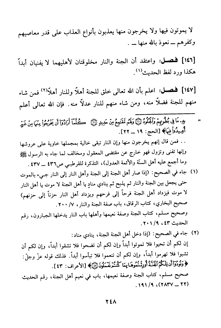 واعتقد أَن الْجنَّة وَالنَّار مخلوقتان لأهليهما لَا يفنيان أبدا هَكَذَا ورد لفظ الحَدِيث