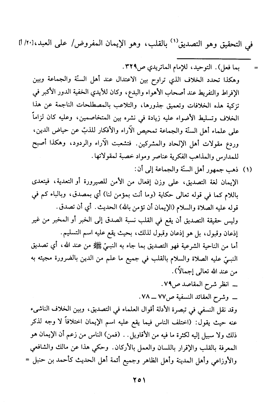 فِي التَّحْقِيق وَهُوَ التَّصْدِيق بِالْقَلْبِ وَهُوَ الْإِيمَان الْمَفْرُوض على العَبْد