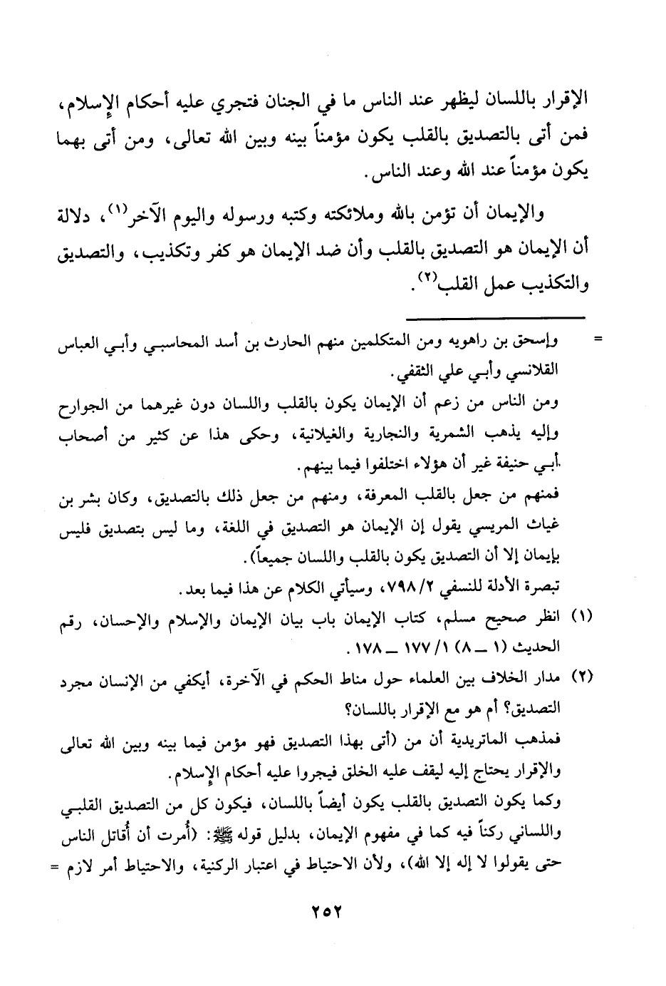 وَالْإِيمَان أَن تؤمن بِاللَّه وَمَلَائِكَته وَكتبه وَرَسُوله وَالْيَوْم الآخر دلَالَة أَن الْإِيمَان هُوَ التَّصْدِيق بِالْقَلْبِ وَأَن ضد الْإِيمَان هُوَ كفر وَتَكْذيب والتصديق والتكذيب عمل الْقلب
