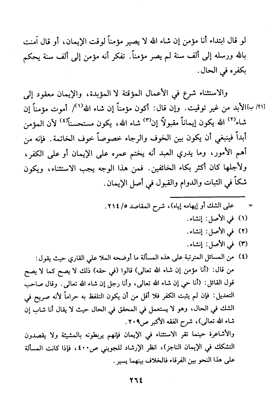 وَالِاسْتِثْنَاء شرع فِي الْأَعْمَال المؤقتة لَا المؤبدة وَالْإِيمَان مَعْقُود إِلَى الْأَبَد من غير تَوْقِيت وَإِن قَالَ أكون مُؤمنا إِن شَاءَ الله أَمُوت مُؤمنا إِن شَاءَ الله يكون إِيمَانًا مَقْبُولًا إِن شَاءَ الله يكون مستحسنا لِأَن الْمُؤمن أبدا فَيَنْبَغِي أَن يكون بَين الْخَوْف والرجاء خُصُوصا خوف الخاتمة فَإِنَّهُ من أهم الْأُمُور وَمَا يدْرِي العَبْد أَنه يخْتم عمره على الْإِيمَان أَو على الْكفْر ولأجلها كَانَ أَكثر بكاء الْخَائِفِينَ فَمن هَذَا الْوَجْه يجب الِاسْتِثْنَاء وَيكون شكا فِي الثَّبَات والدوام وَالْقَبُول فِي أصل الْإِيمَان