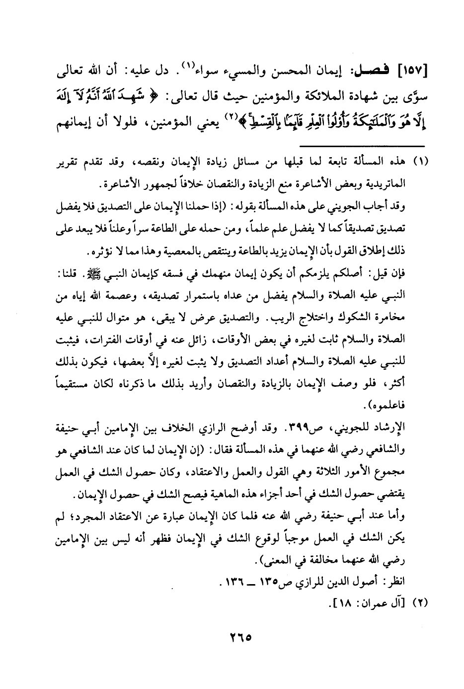 إِيمَان المحسن المسيىء سَوَاء دلّ عَلَيْهِ أَن الله تَعَالَى سوى بَين شَهَادَة الْمَلَائِكَة وَالْمُؤمنِينَ حَيْثُ قَالَ تَعَالَى شهد الله أَنه لَا إِلَه إِلَّا هُوَ وَالْمَلَائِكَة وَأولُوا الْعلم قَائِما بِالْقِسْطِ يَعْنِي الْمُؤمنِينَ فلولا ان إِيمَانهم