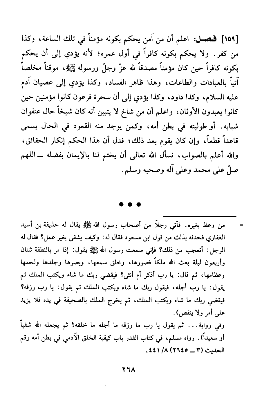 أعلم أَن من آمن يحكم بِكَوْنِهِ مُؤمنا فِي تِلْكَ السَّاعَة وَكَذَا من كفر وَلَا يحكم بِكَوْنِهِ كَافِرًا فِي أول عمره لِأَنَّهُ يُؤَدِّي إِلَى أَن يحكم بِكَوْنِهِ كَافِرًا حِين كَانَ مُؤمنا مُصدقا لله عز وَجل وَرَسُوله صلى الله عَلَيْهِ وَسلم موقنا مخلصا آتِيَا بالعبادات والطاعات وَهَذَا ظَاهر الْفساد وَكَذَا يُؤَدِّي إِلَى عصيان آدم عَلَيْهِ السَّلَام وَكَذَا دَاوُد وَكَذَا يُؤَدِّي لى أَن سحرة فِرْعَوْن كَانُوا مُؤمنين حِين كَانُوا يعْبدُونَ الْأَوْثَان وَاعْلَم أَن من شاخ لَا يتَبَيَّن أَنه كَانَ شَيخا حَال عنفوان شبابه أَو طوليته فِي بطن أمه وَكَمن يُوجد مِنْهُ الْقعُود فِي الْحَال يُسمى قَاعِدا قطعا وَإِن كَانَ يقوم بعد ذَلِك فَدلَّ أَن هَذَا الحكم إِنْكَار الْحَقَائِق وَالله أعلم بِالصَّوَابِ نسْأَل الله تَعَالَى أَن يخْتم لنا بِالْإِيمَان بفضله اللَّهُمَّ صلى على مُحَمَّد وعَلى آله وَصَحبه وَسلم