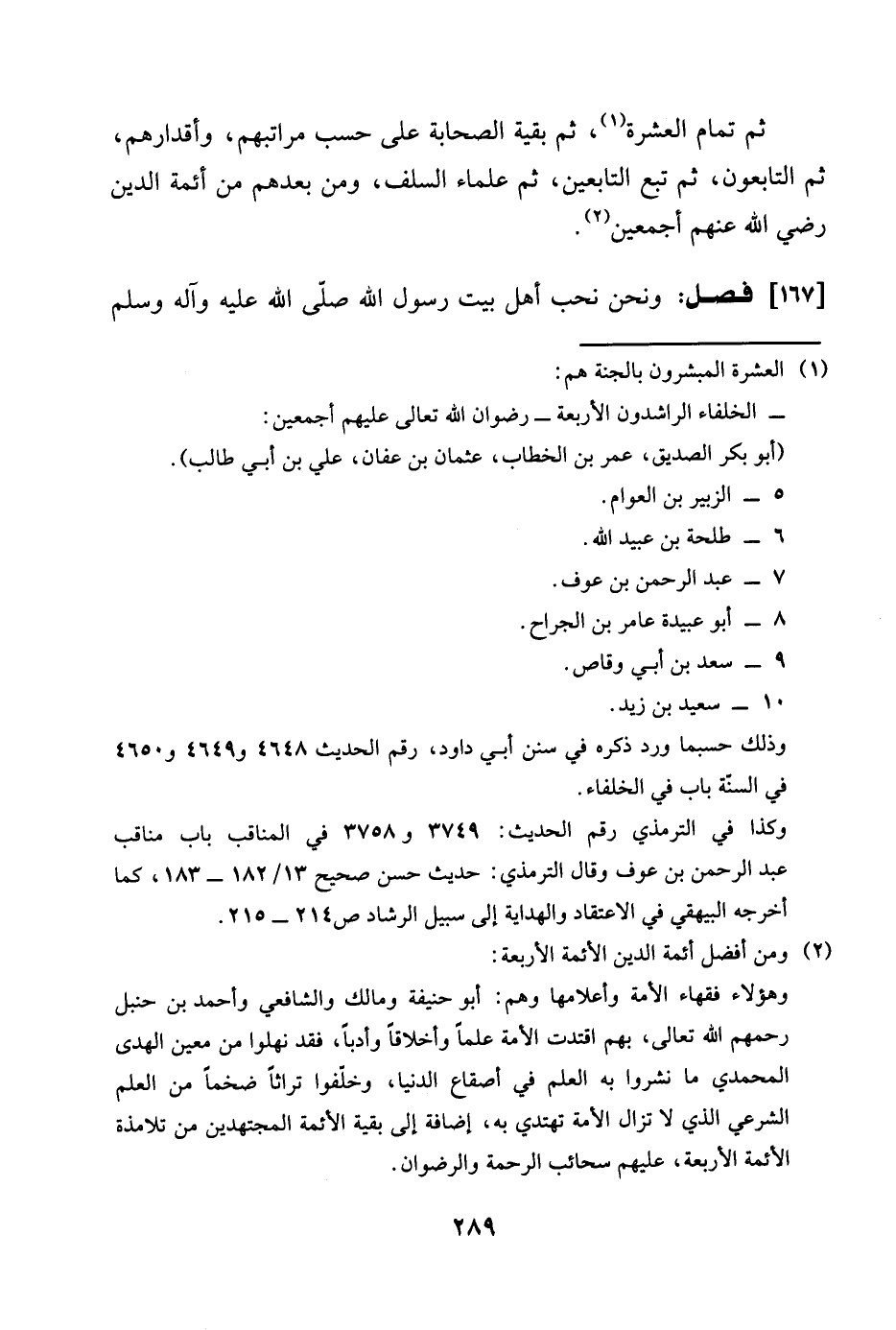 ثمَّ تَمام الْعشْرَة ثمَّ بَقِيَّة الصَّحَابَة على حسب مَرَاتِبهمْ وأقدارهم ثمَّ التابعون ثمَّ تبع التَّابِعين ثمَّ عُلَمَاء السّلف وَمن بعدهمْ من أَئِمَّة الدّين رَضِي الله عَنْهُم أَجْمَعِينَ