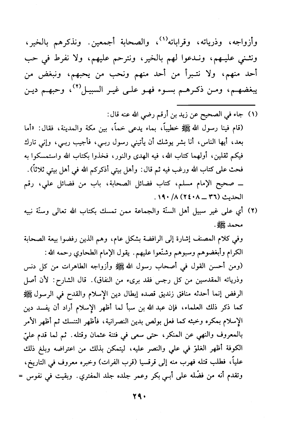 وأزواجه وذرياته وقراباته وَالصَّحَابَة أَجْمَعِينَ ونذكرهم بِالْخَيرِ ونثني عَلَيْهِم وندعوا لَهُم بِالْخَيرِ ونترحم عَلَيْهِم وَلَا نفرط فِي حب أحد مِنْهُم وَلَا نتبرأ من أحد مِنْهُم ونحب من يُحِبهُمْ ونبغض من يبغضهم وَمن ذكرهم بِسوء فَهُوَ على غير السَّبِيل وحبهم دين