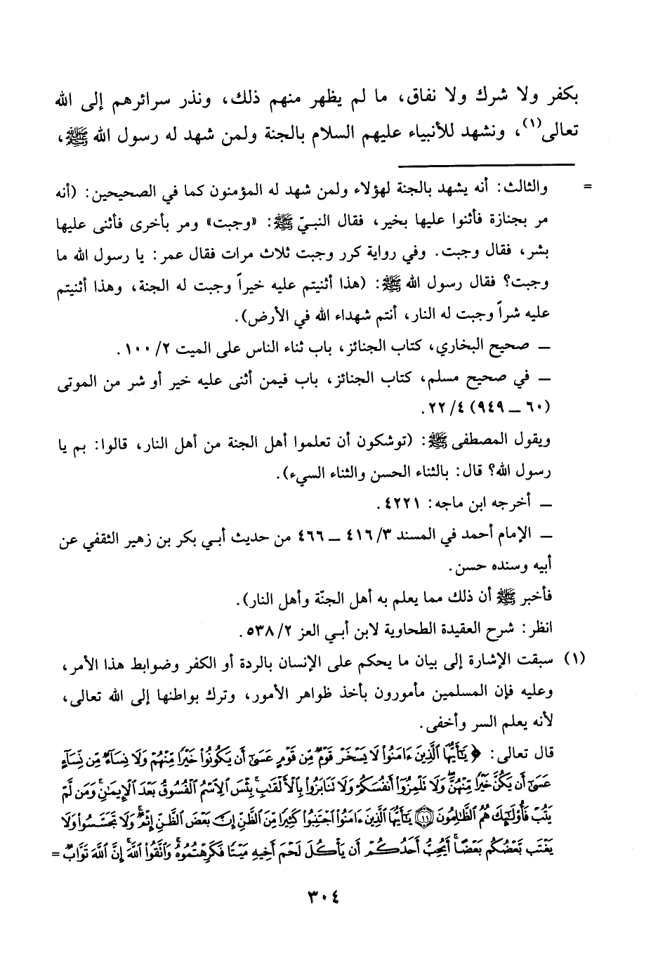بِكفْر وَلَا شرك وَلَا نفاق مَا لم يظْهر مِنْهُم ذَلِك وَنذر سرائرهم إِلَى الله تَعَالَى ونشهد للأنبياء عَلَيْهِم السَّلَام بِالْجنَّةِ وَلمن شهد لَهُ رَسُول الله صلى الله عَلَيْهِ وَسلم