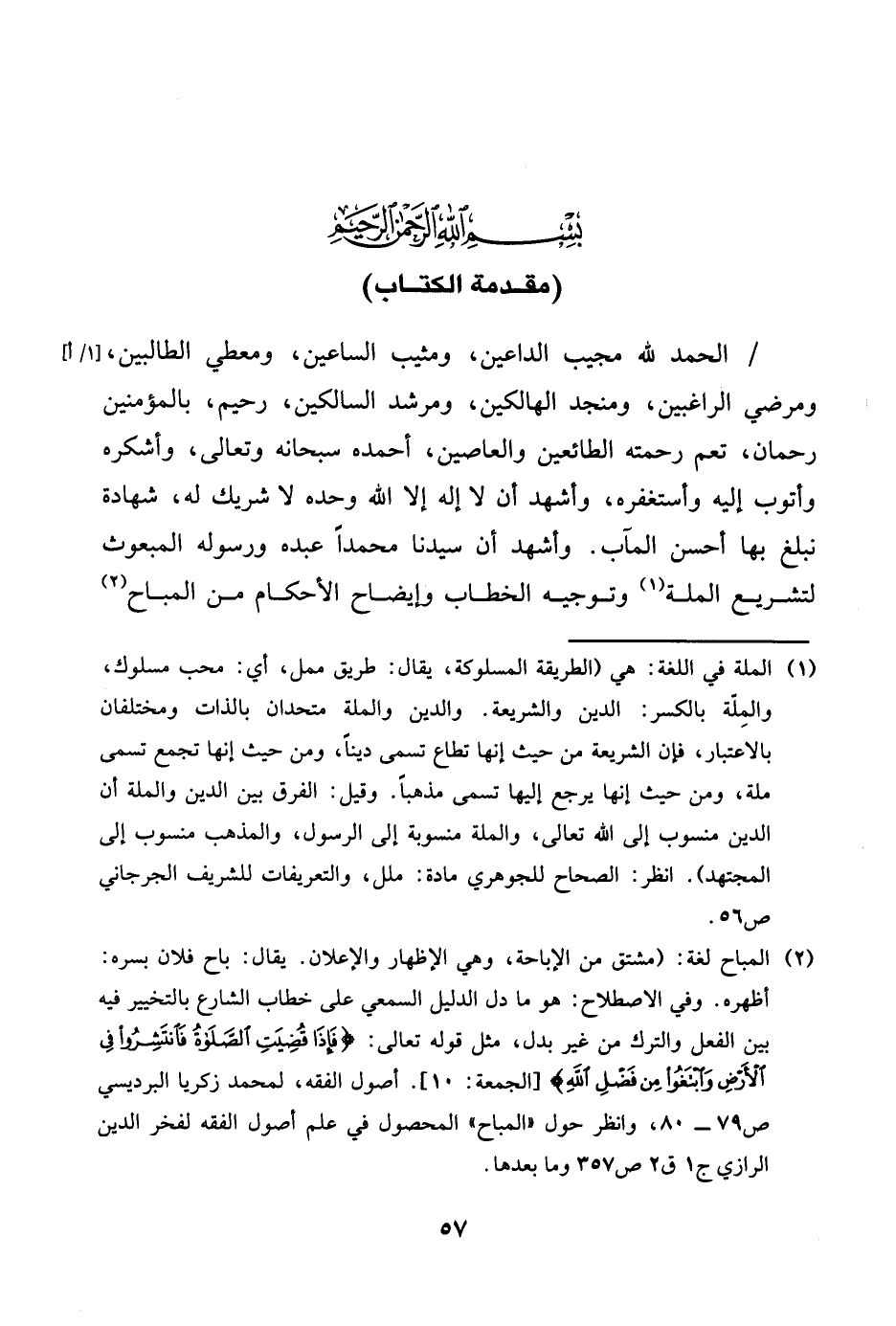 الْحَمد لله مُجيب الداعين ومثيب الساعين ومعطي الطالبين ومرضي الراغبين ومنجد الهالكين ومرشد السالكين رَحِيم بِالْمُؤْمِنِينَ رحمان تعم رحمتهاع الطائعين والعاصين أَحْمَده سُبْحَانَهُ وَتَعَالَى وأشكره وَأَتُوب إِلَيْهِ وأستغفره وَأشْهد أَن لَا إِلَه إِلَّا الله وَحده لَا شريك لَهُ شَهَادَة نبلغ بهَا أحسن المآب وَأشْهد أَن سيدنَا مُحَمَّدًا عَبده وَرَسُوله الْمَبْعُوث لتشريع الْملَّة وتوجيه الْخطاب وإيضاح الْأَحْكَام من الْمُبَاح