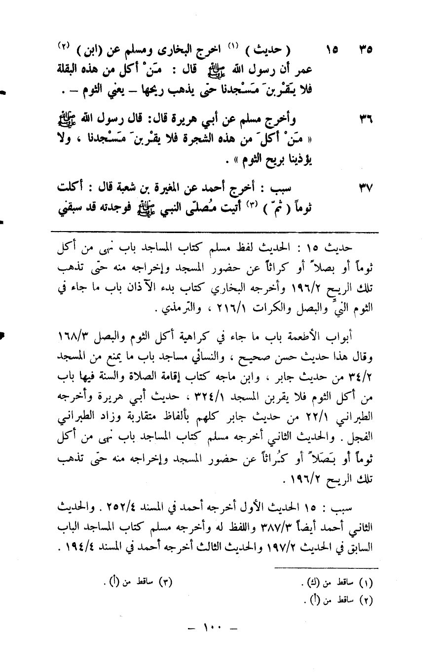 35 ( حديث ) ( 1 ) اخرج البخاري ومسلم عن ( ابن ) ( 2 ) عمر أن رسول الله صلى الله عليه وسلم قال من اكل من هذه البقلة فلا يقربن مسجدنا حتى يذهب ريحها يعني الثوم