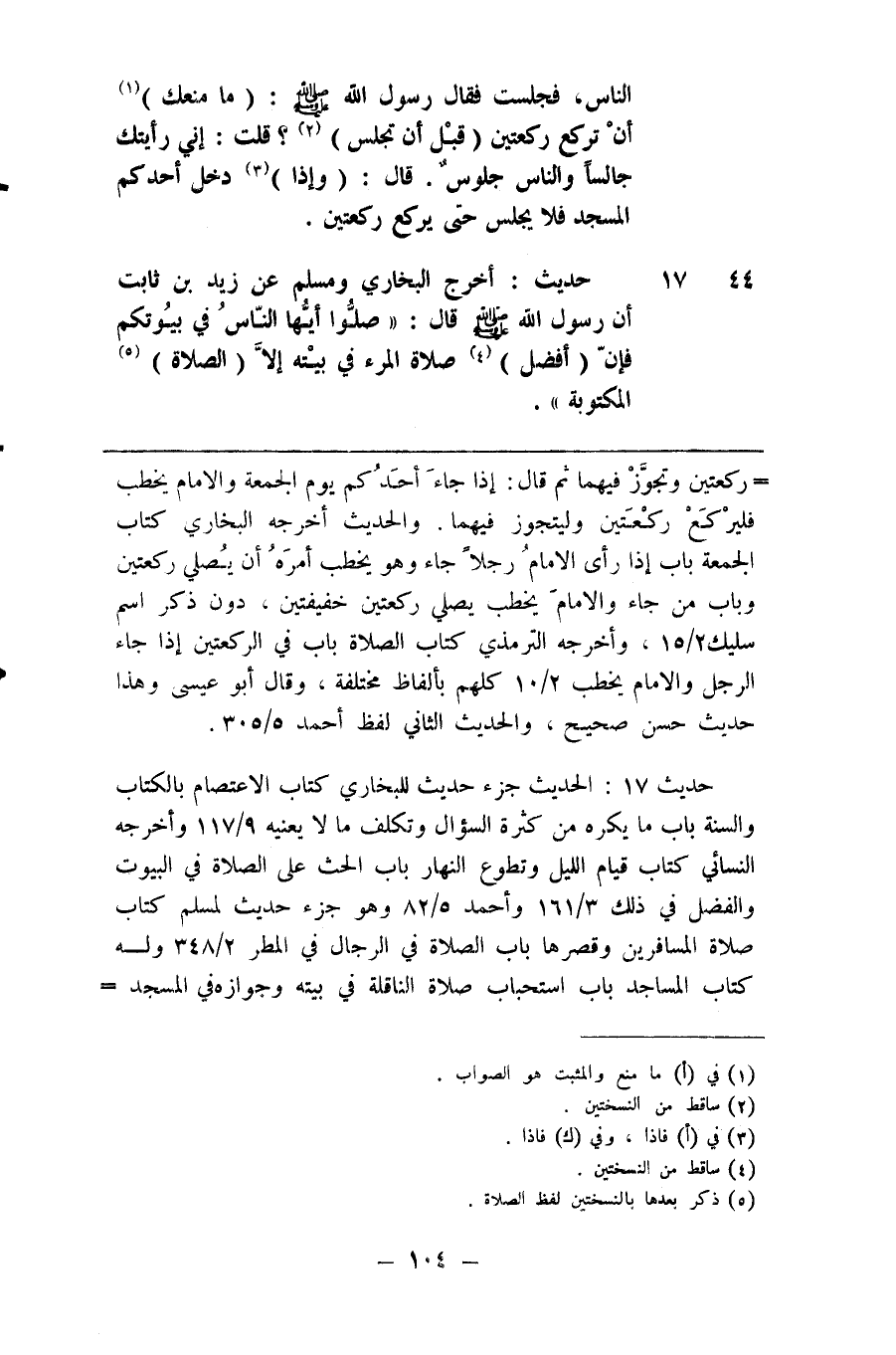 17 حديث أخرج البخاري ومسلم عن زيد بن ثابت ان رسول الله صلى الله عليه وسلم قال صلوا ايها الناس في بيوتكم فإن افضل ( 4 ) صلاة المرء في بيته إلا الصلاة ( 5 ) المكتوبة