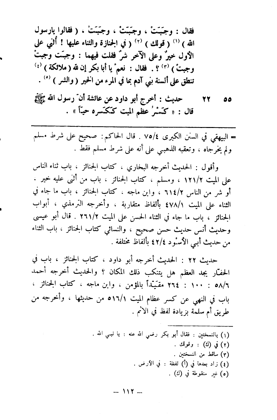 55 حيدث اخرج أبو داود عن عائشة أن رسول صلى الله عليه وسلم قال كسر عظم الميت ككسره حيا