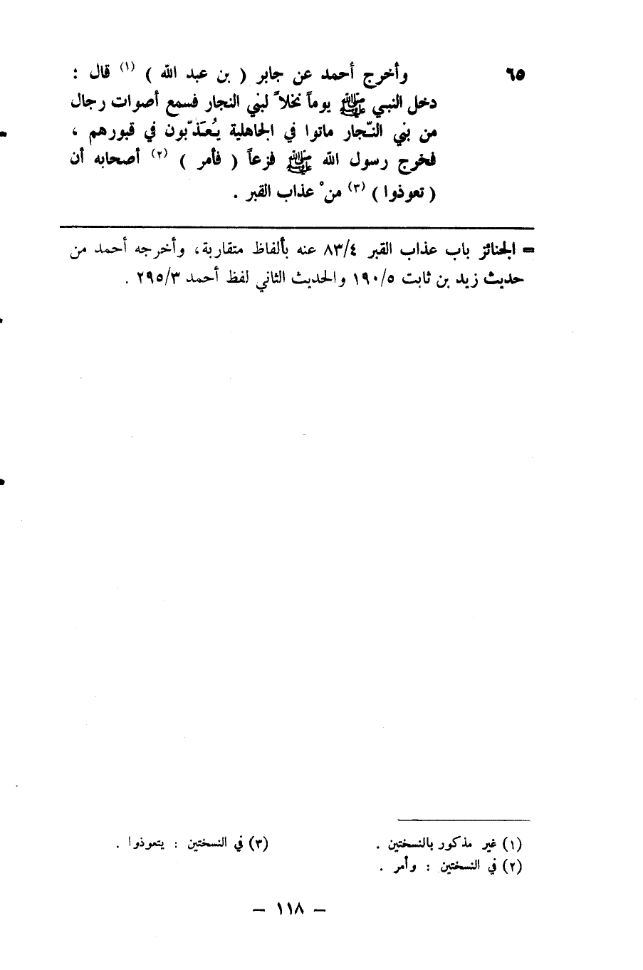 65 وأخرج أحمد عن جابر 0 بن عبد الله ) ( 1 ) قال دخل النبي صلى الله عليه وسلم يوما نخلا لبني النجار فسمع أصوات رجال من بني النجار ماتوا في الجاهلية يعذبون في قبورهم فخرج رسول الله صلى الله عليه وسلم فزعا ( فأمر ) ( 2 ) أصحابه أن تعوذوا ( 3 ) من عذاب القبر