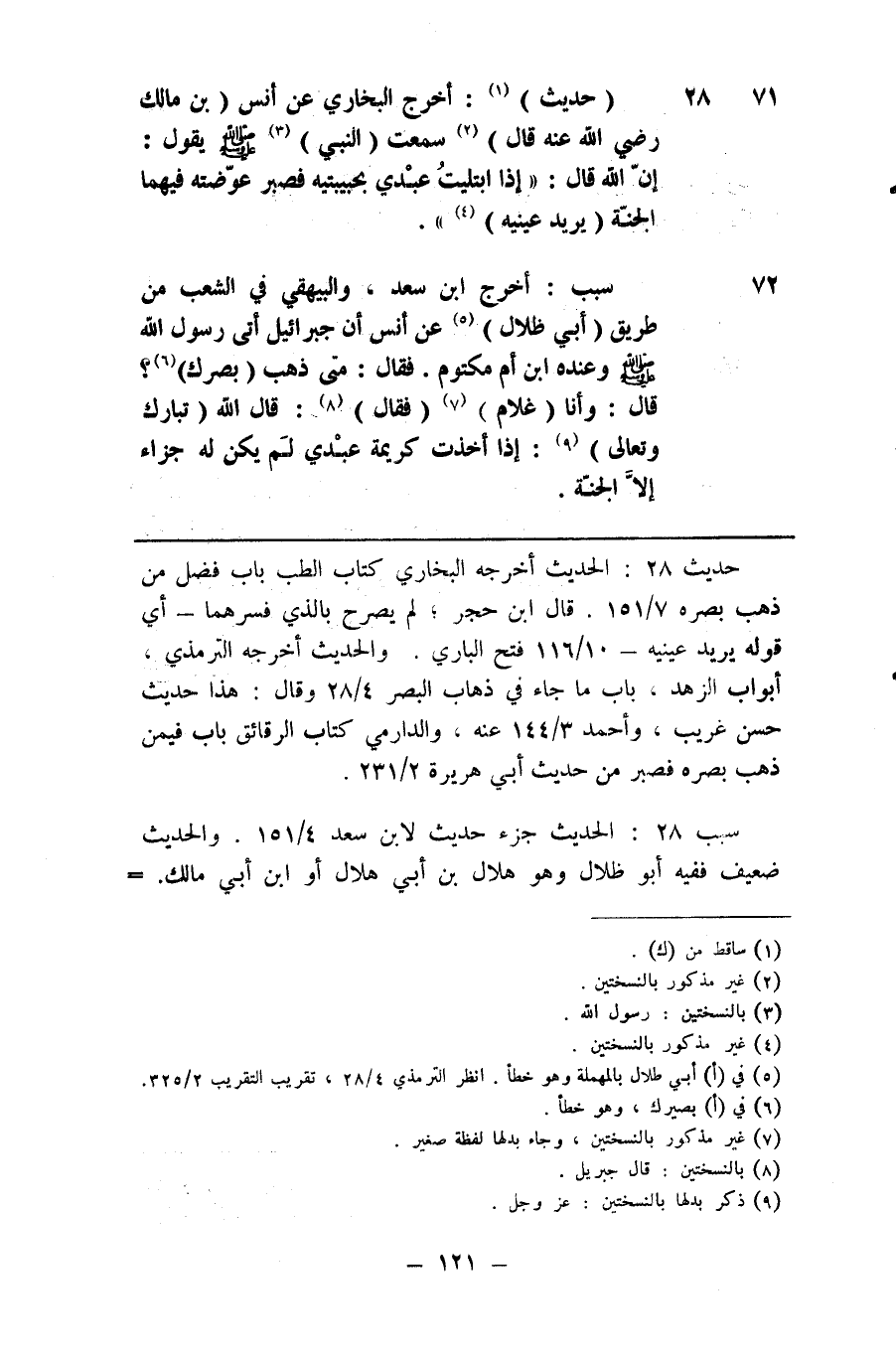 71 ( حديث ) ( 1 ) اخرج البخاري عن أنس ( بن مالك رضي الله عنه قال ) 02 ) سمعت ( النبي ) ( 3 ) صلى الله عليه وسلم يقول إن الله قال إذا ابتليت عبدي بحبيبتيه فصبر عوضته فيهما الجنة ( يريد عينيه ) ( 4 )