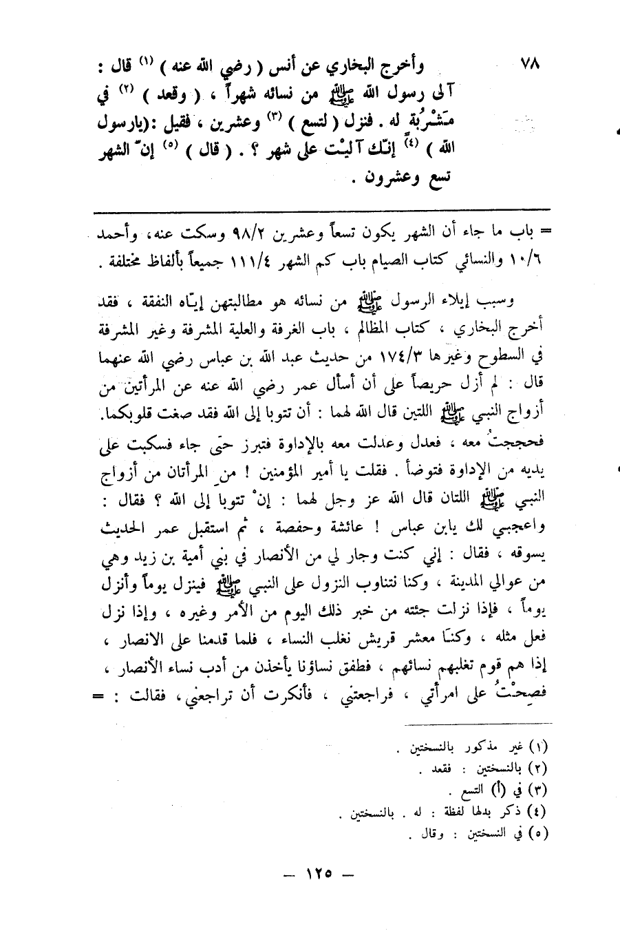 78 وأخرج البخاري عن أنس ( رضي الله عنه ) ( 1 ) قال آلى رسول الله صلى الله عليه وسلم من نسائه شهرا ( وقعد ) ( 2 ) في مشربه له فنزل ( لتسع ) ( 3 ) وعشرين فقيل ( يا رسول ) إنك آليت على شهر قال ( 5 ) إن الشهر تسع وعشرون
