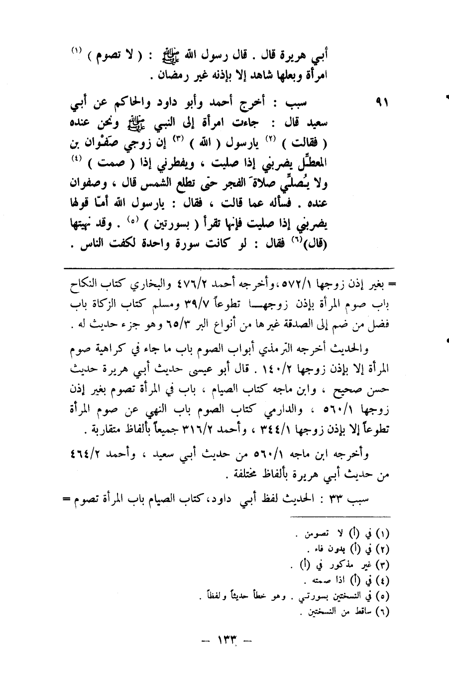 أبي هريرة قال قال رسول الله صلى الله عليه وسلم ( لاتصوم ) ( 1 ) امرأة وبعلها شاهد إلا بإذنه غير رمضان