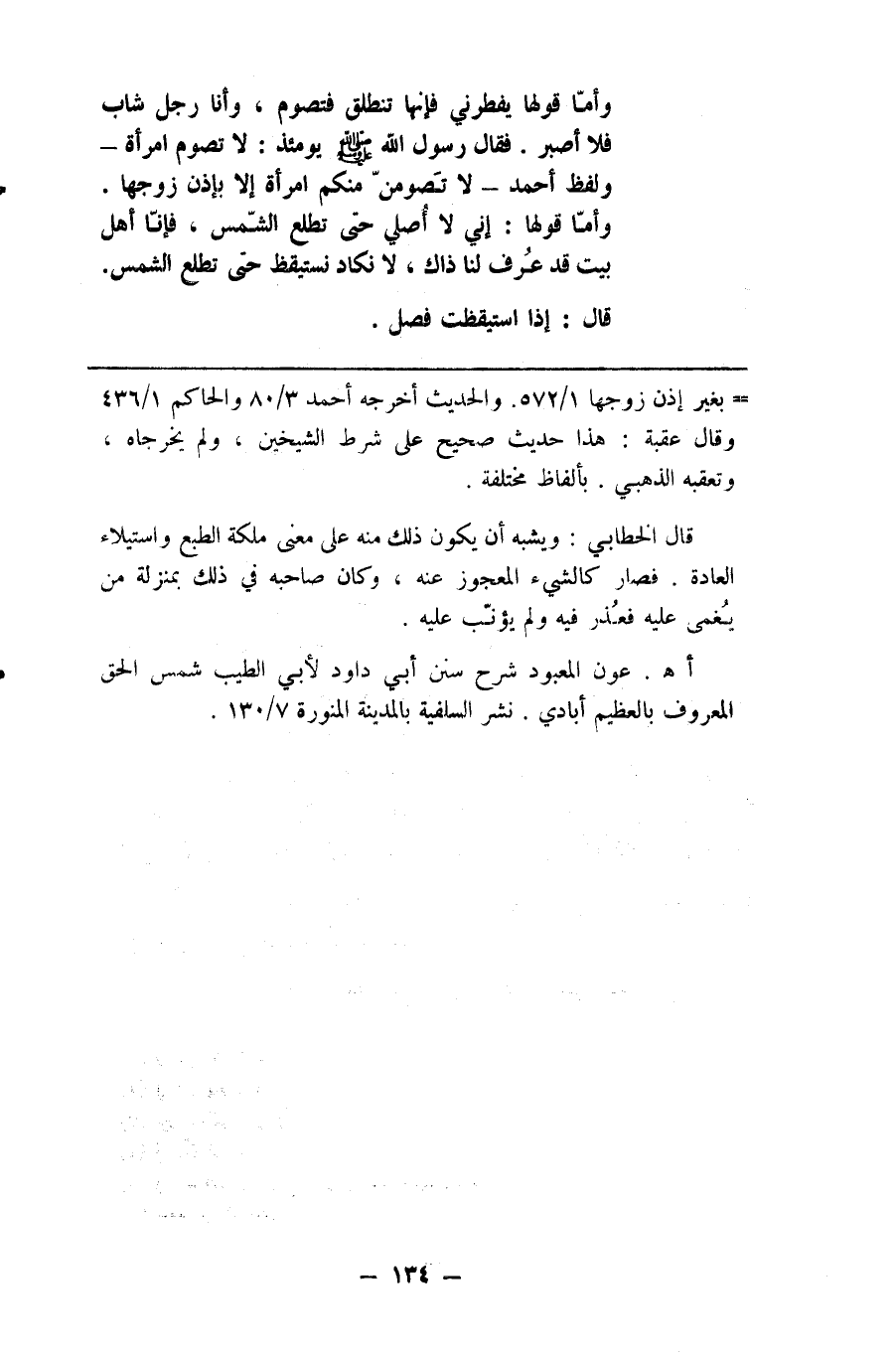 وأما قولها يفطرني فإنها تنطلق فتصوم وأنا رجل شاب فلا أصبر فقال رسول الله صلى الله عليه وسلم يومئذ لا تصوم امرأة ولفظ أحمد لاتصومن منكم أمرأة إلا بإذن زوجها وأما قولها إني لا أصلي حتى تطلع الشمس فإنا أهل بيت قد عرف لنا ذاك لا نكاد نستيقظ حتى تطلع الشمس قال إذا استيقظت فصل