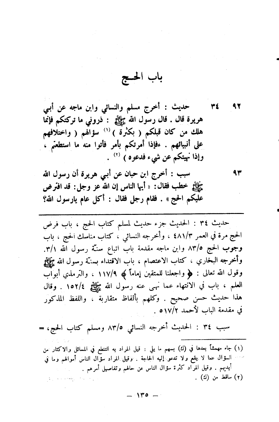 92 حديث أخرج مسلم والنسائي وابن ماجه عن أبي هريرة قال قال رسول الله صلى الله عليه وسلم ذروني ما تركتكم فإن ما هلك من كان قبلكم بكثرة ( 1 ) سؤالهم واختلافهم على أنبيائهم فإذا أمرتكم بأمر فأتوا منه ما استطعتم وإذا نهيتكم عن شيء فدعوه ( 2 ) سبب أخرج ابن حبان عن أبي هريرة ان رسول الله صلى الله عليه وسلم خطب فقال أيها الناس إن الله عز وجل قد افترض عليكم الحج فقام رجل فقال أكل عام يا رسول الله