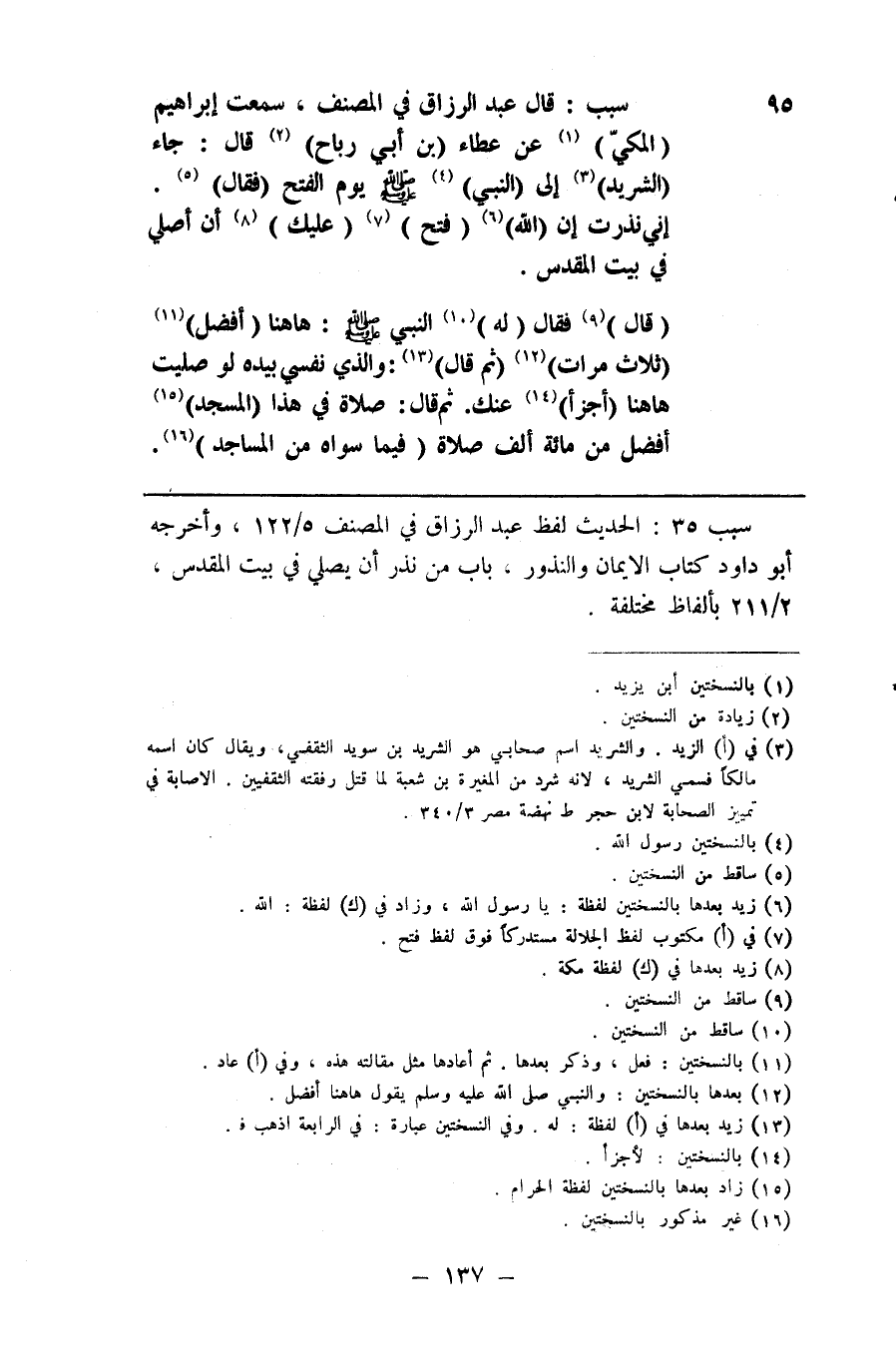 95 سبب قال عبد الرزاق في المصنف سمعت إبراهيم ( المكي ) ( 1 ) عن عطاء بن ابي رباح ( 2 ) قال جاء الشريد ( 3 ) إلى النبي ( 4 ) صلى الله عليه وسلم يوم الفتح فقال ( 5 ) إني نذرت إن الله 06 ) فتح ( 7 ) عليك ( 8 ) أن أصلي في بيت المقدس ( قال ) ( 9 ) فقال ( له ) ( 10 ) النبي صلى الله عليه وسلم ها هنا ( أفضل ) ( 11 ) ثلاث مرات ( 12 ) ثم قال ( 13 ) والذي نفسي بيده لو صليت ها هنا أجزأ ( 14 ) عنك ثم قال صلاة في هذا المسجد 0159 أفضل من مائة ألف صلاة فيما سواه من المساجد ( 16 )