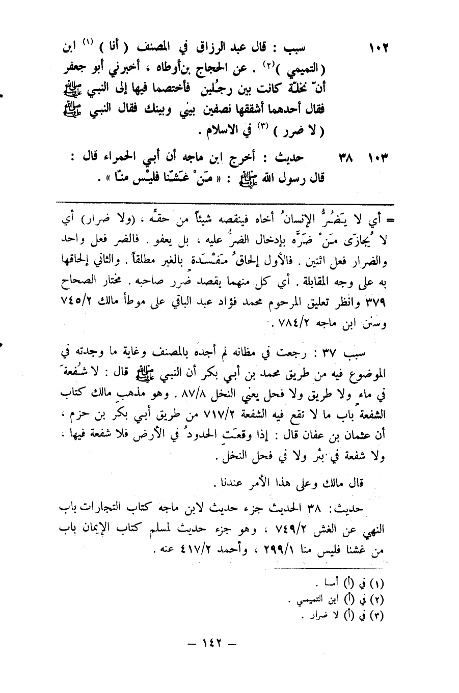 102 سبب قال عبد الرزاق في المصنف أنا ( 1 ) ابن التميمي ) ( 2 ) عن الحجاج ابن أوطاه أخبرني أبو جعفر أن نخلة كانت بين رجلين فأختضمنا فيها إلى النبي صلى الله عليه وسلم فقال أحدهما أشققها نصفين بيني وبينك فقال النبي صلى الله عليه وسلم لا ضرر ( 3 ) في الاسلام
