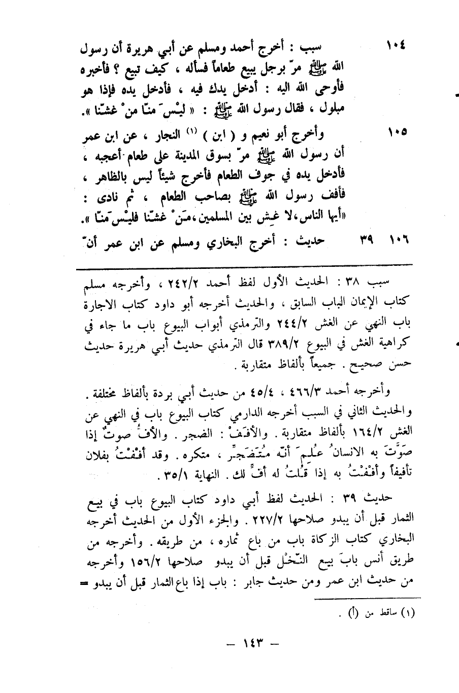 105 وأخرج أبو نعيم و ( ابن ) ( 1 ) النجار عن ابن عمر أن رسول الله صلى الله عليه وسلم مر بسوق المدينة على طعام أعجبه فأدخل يده في جوف الطعام فأخرج شيئا ليس بالظاهر فأفف رسول الله صلى الله عليه وسلم بصاحب الطعام ثم نادى أيها الناس لا غش بين المسلمين من غشنا فليس منا