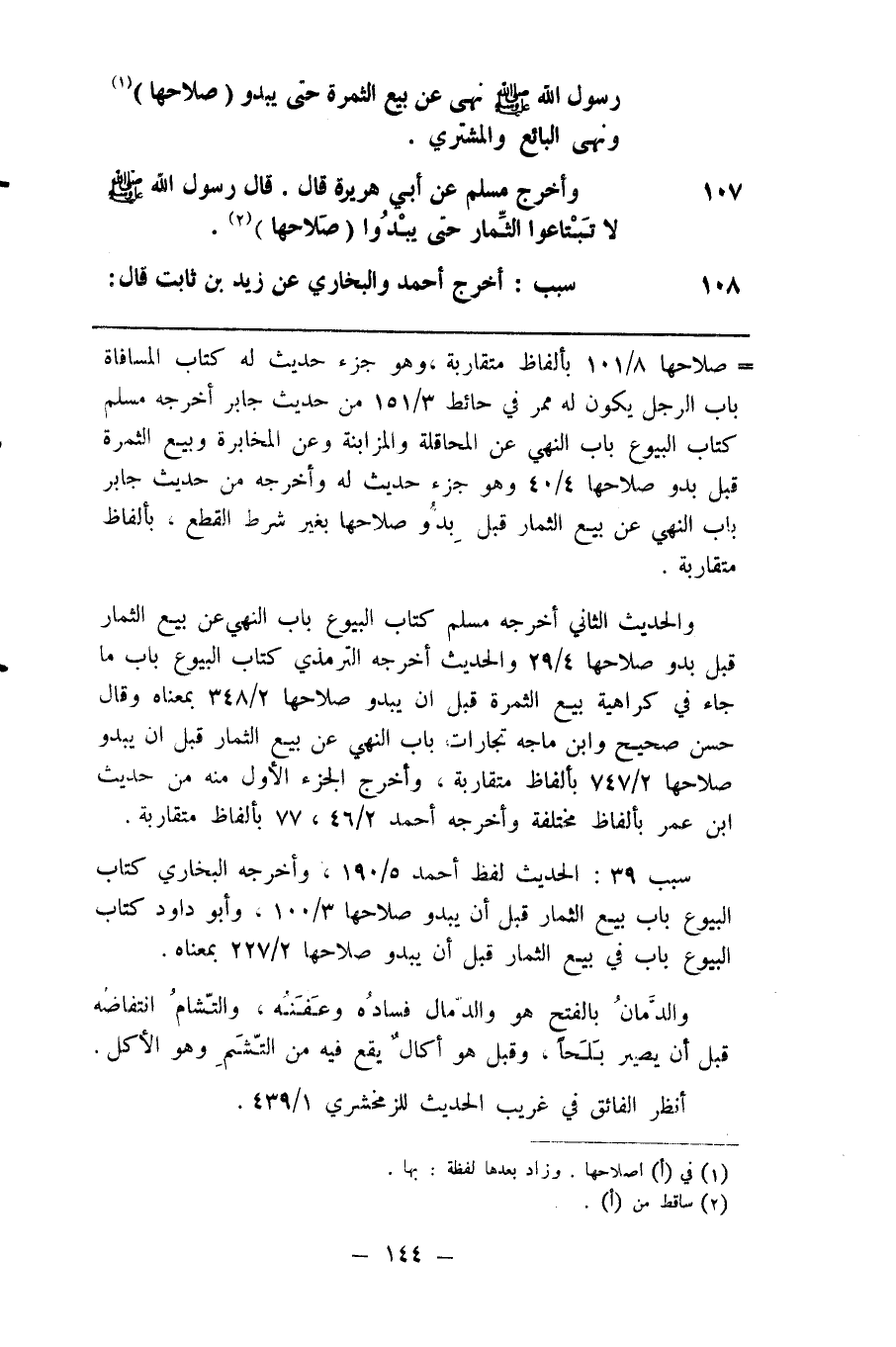 107 وأخرج مسلم عن أبي هريرة قال قال رسول الله صلى الله عليه وسلم لا تبتاعوا الثمار حتى يبدوا صلاحها ( 2 )