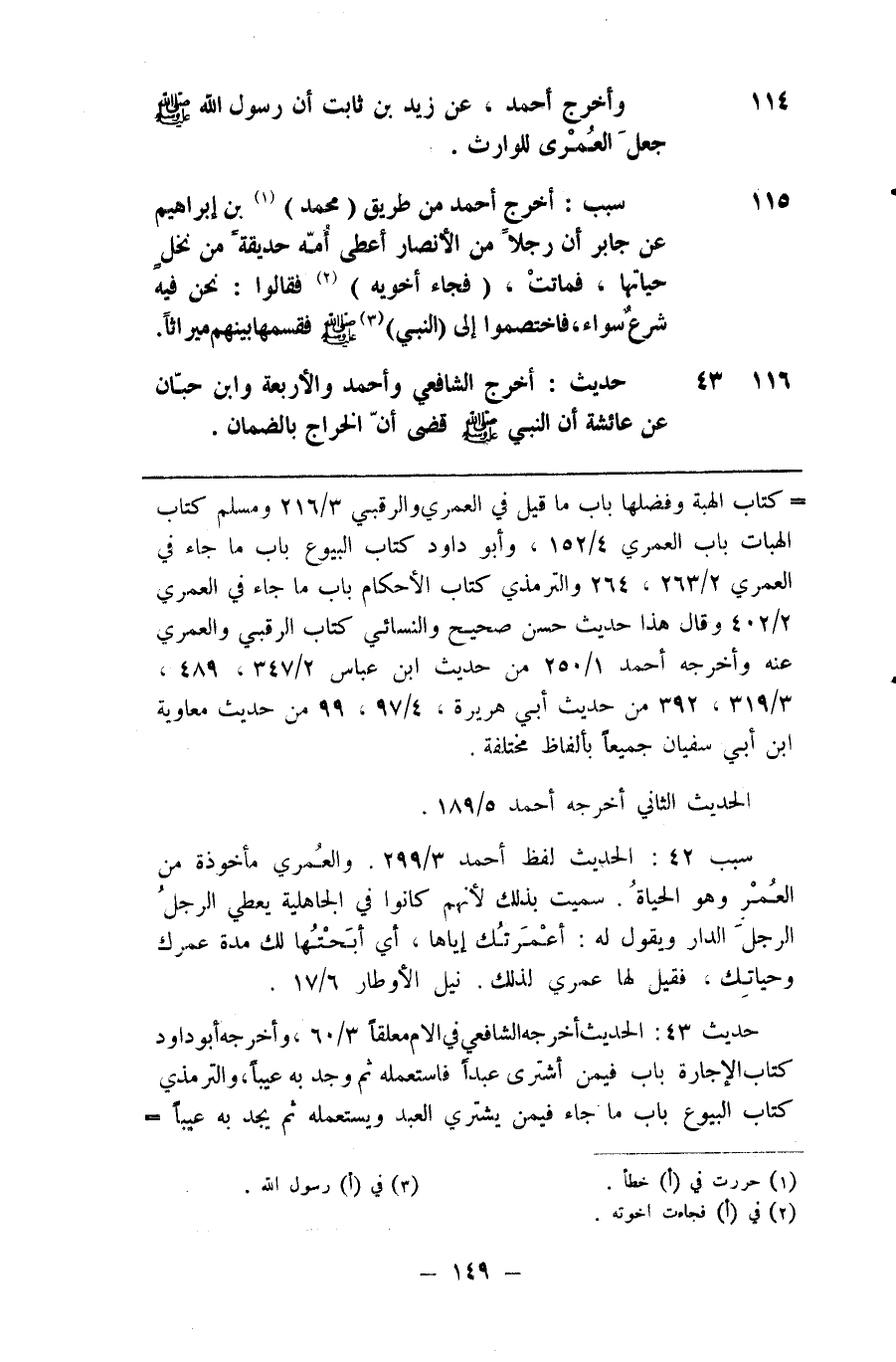 114 وأخرج أحمد عن زيد بن ثابت أن رسول الله صلى الله عليه وسلم جعل العمرى للوارث