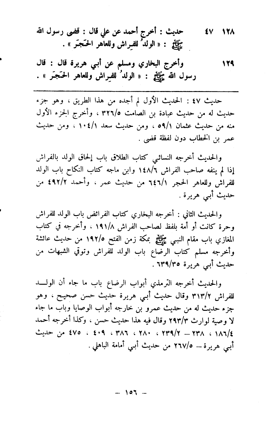 128 حديث أخرج أحمد عن علي قال قضى رسول الله صلى الله عليه وسلم الولد للفراش وللعاهر الحجر