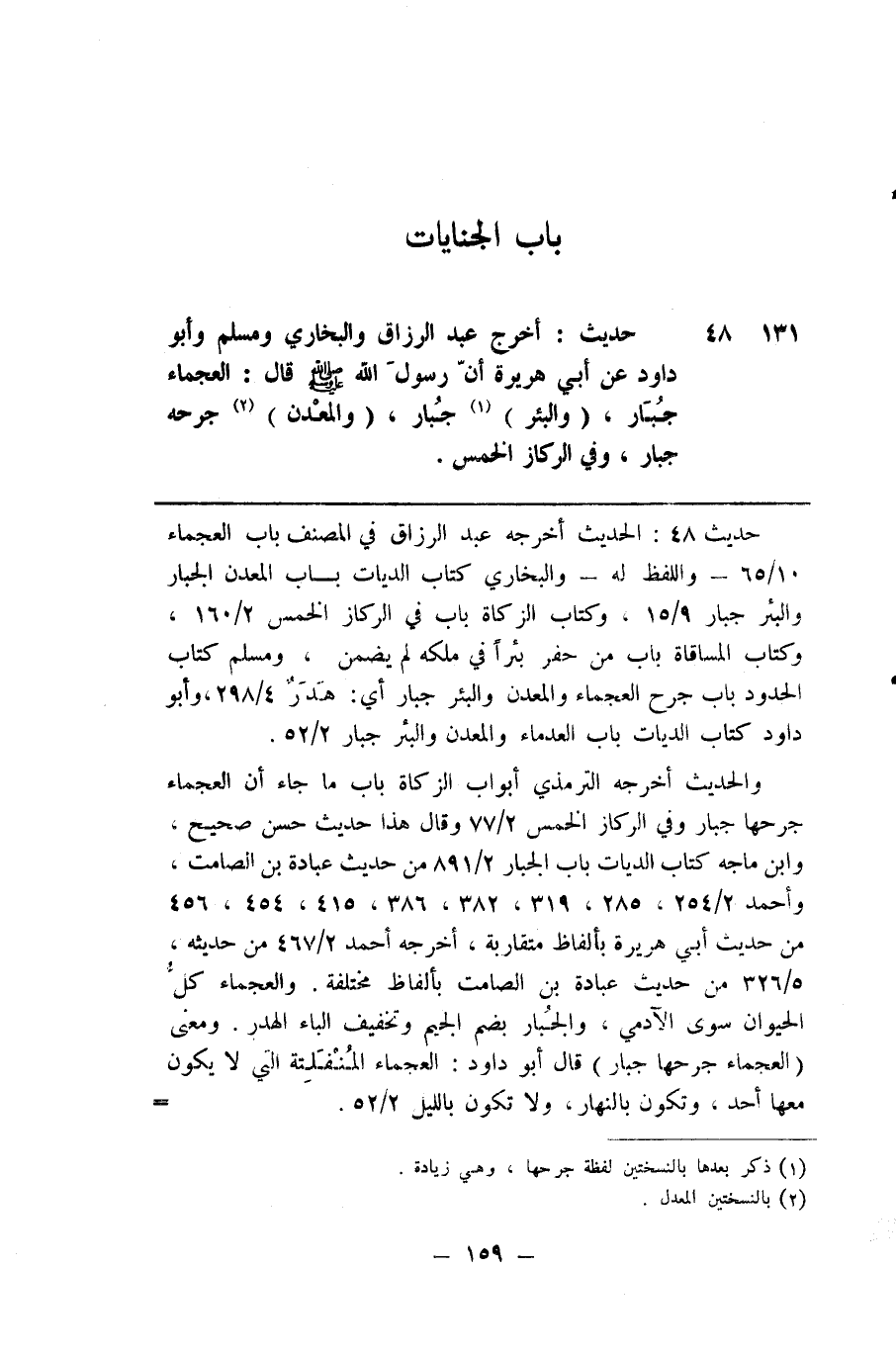 131 حديث أخرج عبد الرزاق والبخاري ومسلم وابو داود عن أبي هريرة أن رسول الله صلى الله عليه وسلم قال العجماء جبار والبئر ( 1 ) جبار والمعدن ( 2 ) جرحه جبار وفي الركاز الخمس