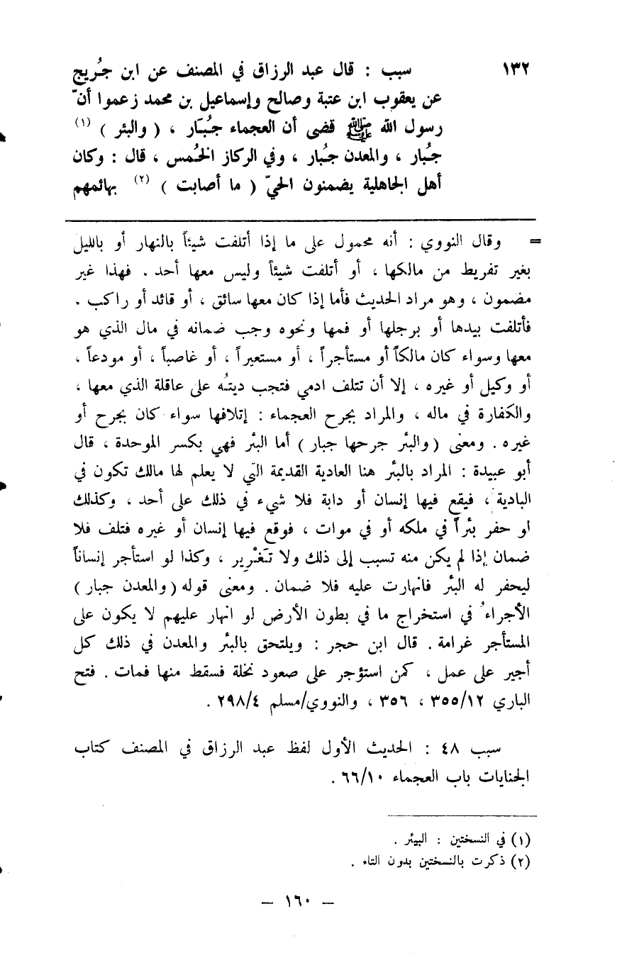 132 سبب قال عبد الرزاق في المصنف عن ابن جريج عن يعقوب ابن عتبة وصالح وإسماعيل بن محمد زعموا أن رسول الله صلى الله عليه وسلم قضى أن العجماء جبار ( والبئر ) ( 1 ) جبار والمعدن جبار وفي الركاز الخمس قال وكان أهل الجاهلية يضمنون الحي ( ما أصابت ) ( 2 ) بهائمهم
