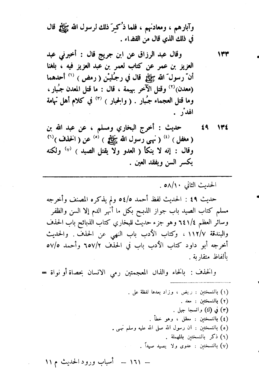 134 حديث أخرج البخاري ومسلم عن عبد الله بن مغفل ( 4 ) نهى رسول الله صلى الله عليه وسلم ( 5 ) عن الحذف ( 6 ) وقال إنه لا ينكأ العدو ولا يقتل الصيد ( 7 ) ولكنه يكسر السن ويفقد العين