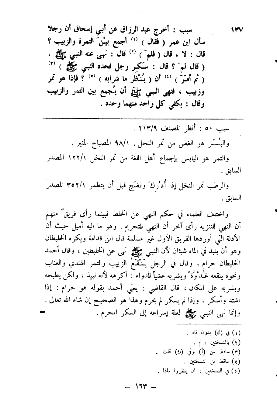17 سبب اخرج عبد الرزاق عن أبي إسحاق أن رجلا سأل ابن عمر ( فقال ) ( 1 ) أجمع بين التمرة والزبيب قال لا قال ( فلم ) ( 2 ) قال نهى عنه النبي صلى الله عليه وسلم قال لم قال سكر رجل فحده النبي صلى الله عليه وسلم ( 3 ) ثم امر ( 4 ) أن ينظر ما شرابه ( 5 ) فإذا هو تمر وزبيب فنهى النبي صلى الله عليه وسلم أن يجمع بين التمر والزبيب وقال يكفي كل واحد منهما وحده