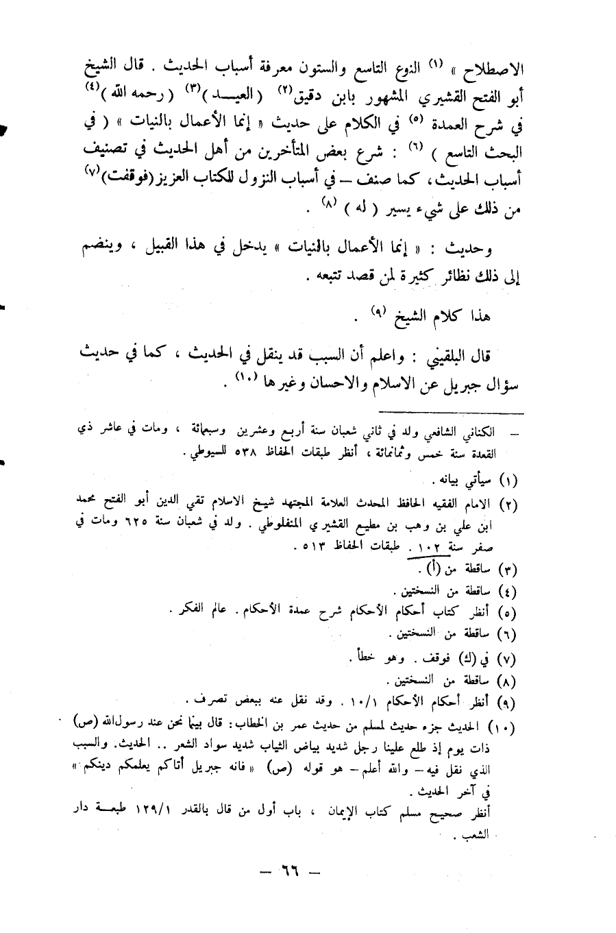 الاصطلاح ( 1 ) النوع التاسع والستون معرفة اسباب الحديث قال الشيخ أبو الفتح القشيري المشهور بابن دقيق ( 2 ) ( العيد ) ( 3 ) ( رحمه الله ) ( 4 ) في شرح العمدة ( 5 ) في الكلام على حديث إنما الأعمال بالنيات ( في البحث التاسع ) ( 6 ) شرع بعض المتأخرين من أهل الحديث في تصنيف أسباب الحديث كما صنف في اسباب النزول للكتاب العزيز ( فوقفت ) ( 7 ) من ذلك على شيء يسير ( له ) ( 8 ) وحديث إنما الأعمال بالنيات يدخل في هذا القبيل وينضم إلى ذلك نظائر كثيرة لمن قصد تتبعه هذا كلام الشيخ ( 9 ) قال البلقيني وأعلم أن السبب قد ينقل في الحديث كما في حديث سؤال جبريل عن الاسلام والاحسان وغيرها ( 10 )
